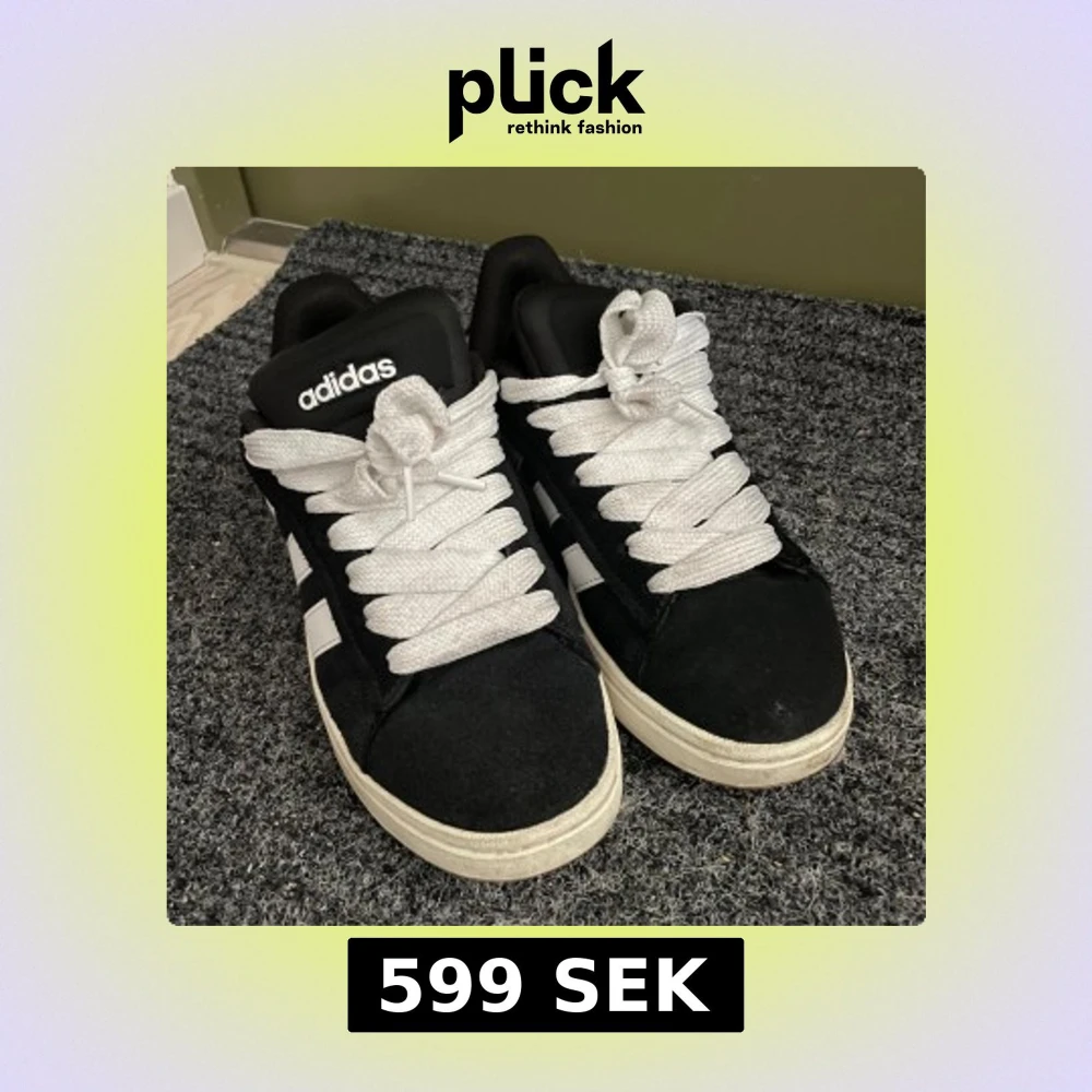 Klassiska svarta Adidas sneakers med vita ränder och breda vita skosnören. Skorna har låg profil, platt sula och rund tå. Ovandelen är i mocka och textil, med tydlig Adidas-logga på plösen och sidan. Perfekta för en sportig och avslappnad stil. Orginallåda tillkommer.