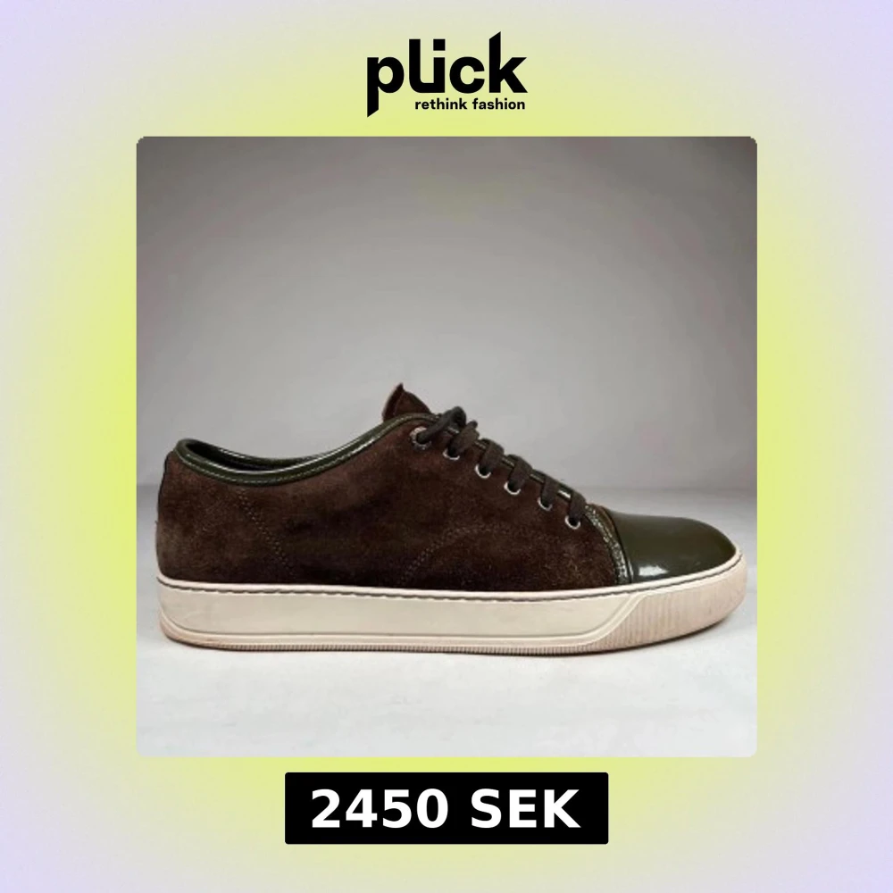 Snygga lanvins i mörkbrunt mocka med olivgröna lackade tår och detaljer. Skorna har snörning och en vit platt sula som ger en clean look. Perfekta för dig som gillar en stilren men ändå unik vibe. Bara skorna medföljer självklart äkta storlek 44 uk 10
