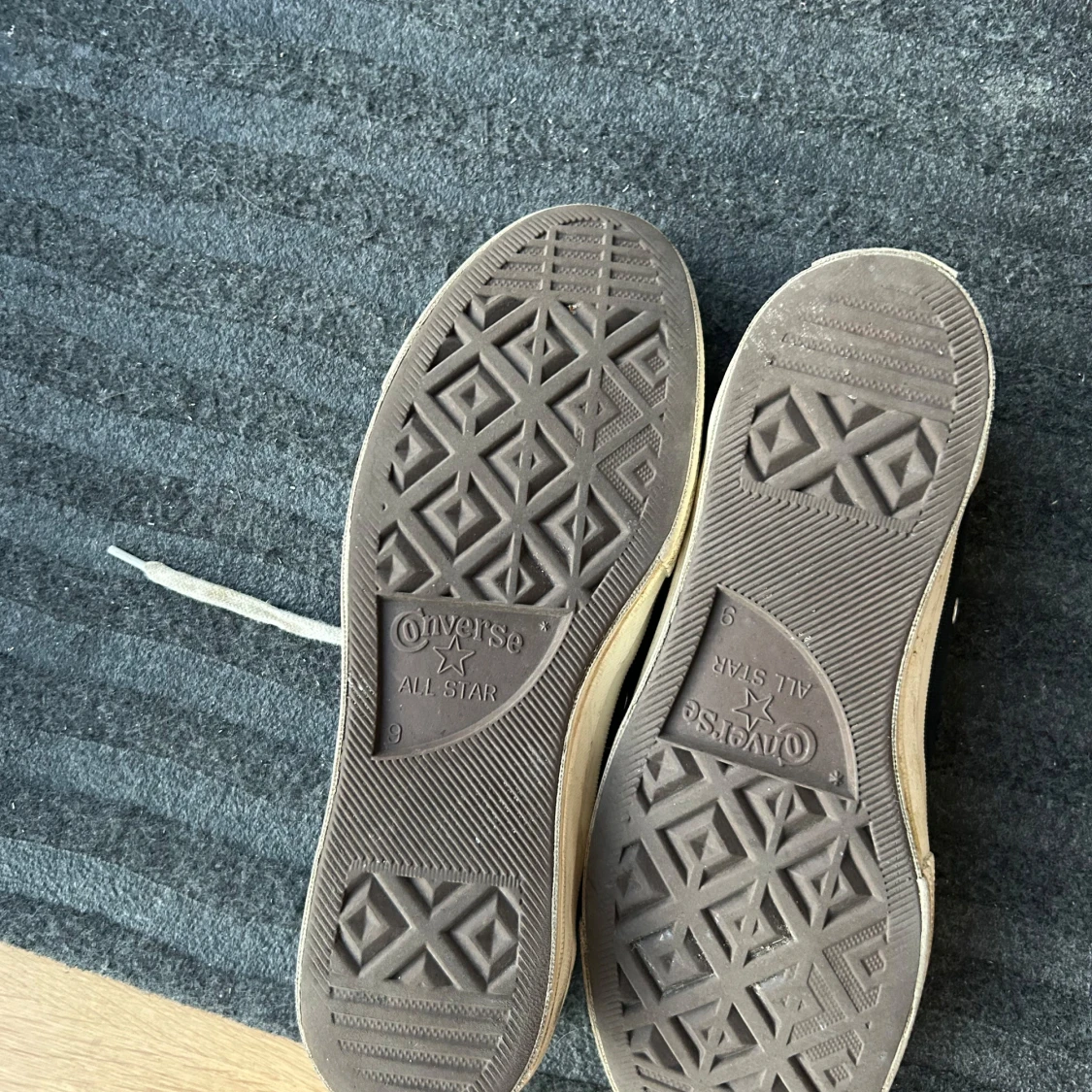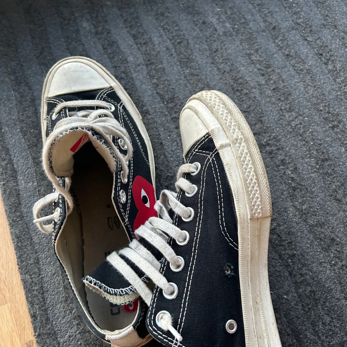 Svarta Converse x Comme des Garçons Play sneakers med den ikoniska röda hjärtloggan på sidan😍 Ett par riktigt fina skor som har används sparsamt och är darför i ett bra skick. Den enda defekten med skorna ser du på bild 2. Där en av nitarna ramlat av på sidan på en av skorna men det är det ända🤯 Priset går att diskutera vid snabb affär‼️💸