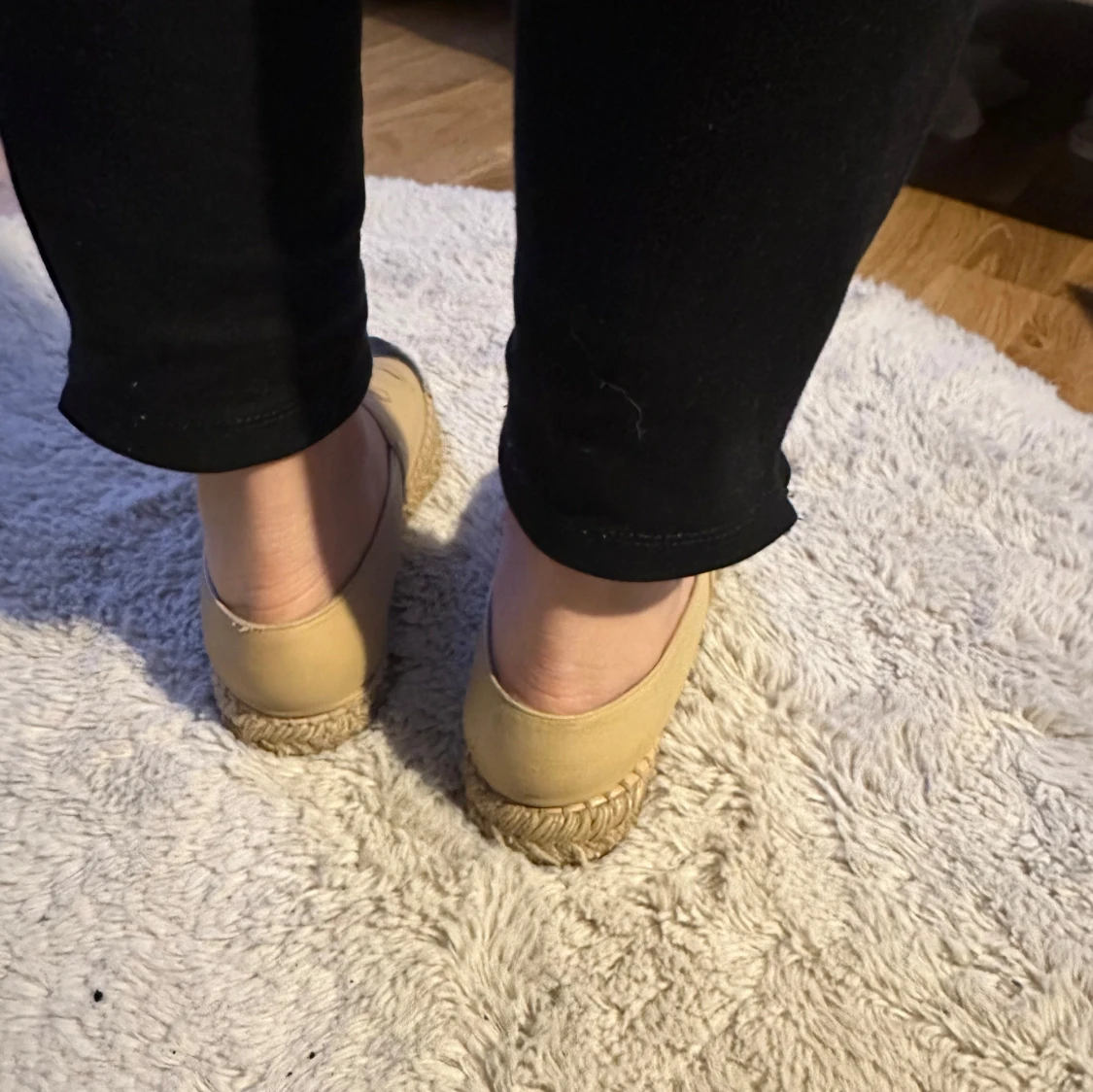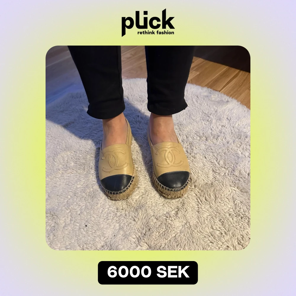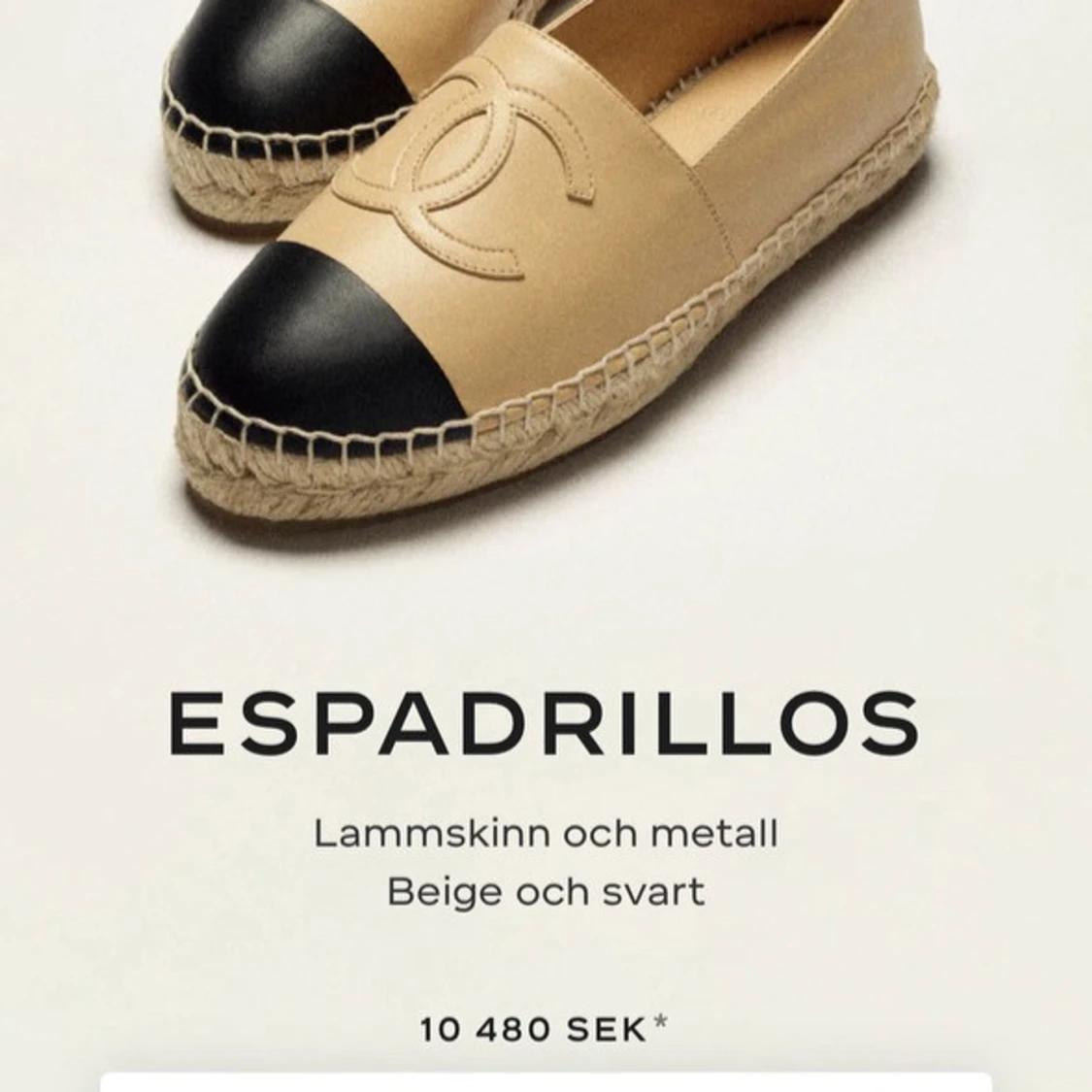 Säljer ett par lyxiga espadrillos från Chanel i beige och svart lammskinn. De har en snygg Chanel logga på ovansidan och en klassisk flätad sula. Perfekta för en stilren och bekväm look. Använda men i bra skick. Passar perfekt till både vardag och fest. Köpta på Bangkok flygplats ord pris 10480kr idag!