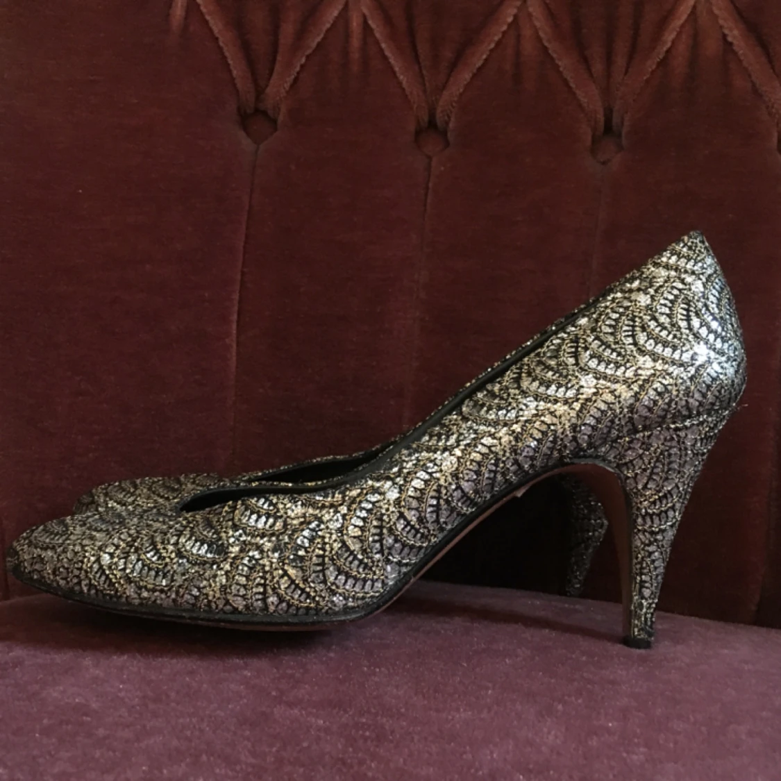 Döläckra klackar. 7,5 cm höga. ”Glittrar” i ljuset, vilket är svårt att fånga på bild. Passar mig med strl 38,5. Möts upp i Uppsala.