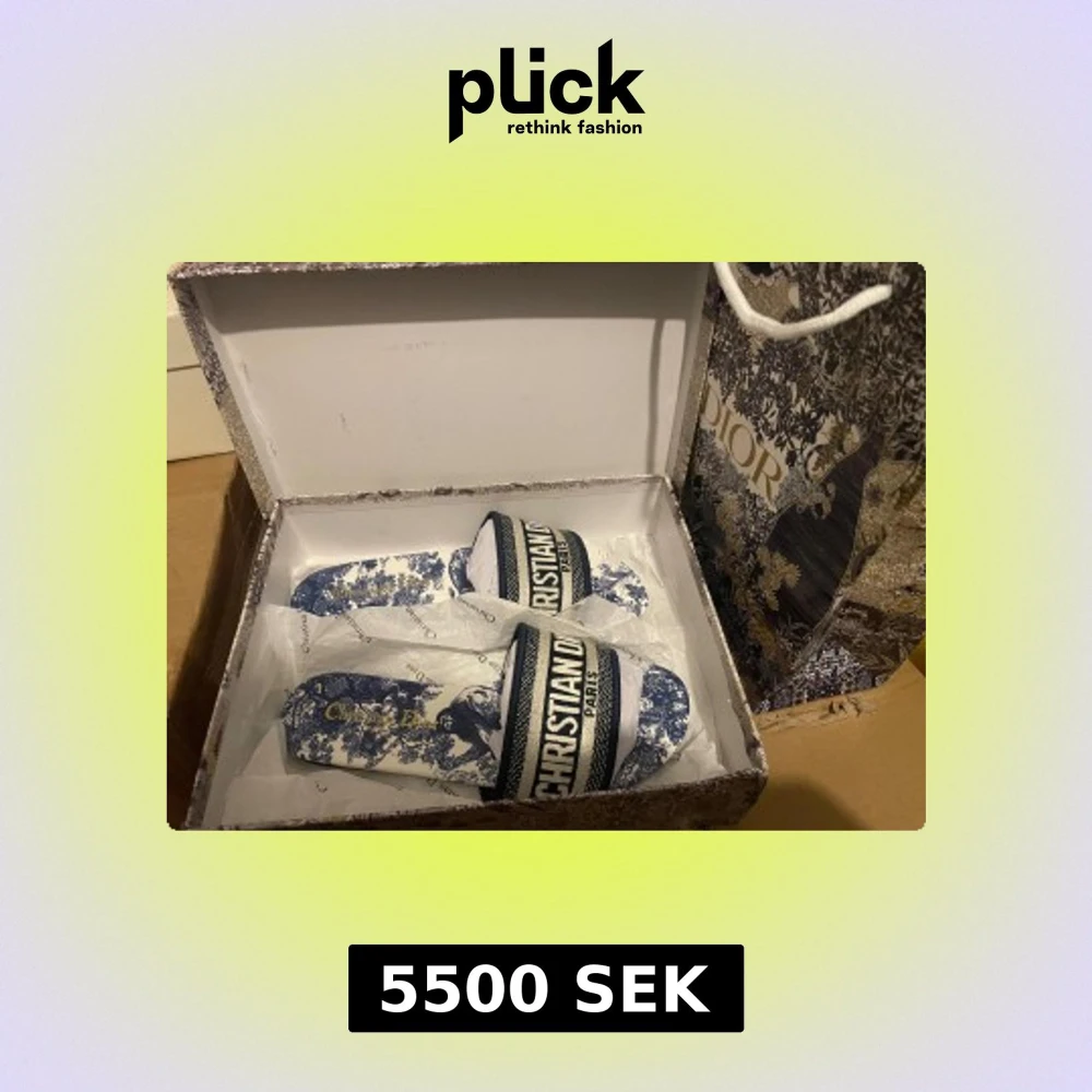 Säljer ett par lyxiga sandaler från Christian Dior i storlek 39. De är blåvita med ett unikt mönster och har tydlig Dior-logga broderad på remmen. Sulan är i skinn och sandalerna har en platt sula. Skolåda och Bag till kommer‼️ fraktar samma dag eller dagen därpå🙌