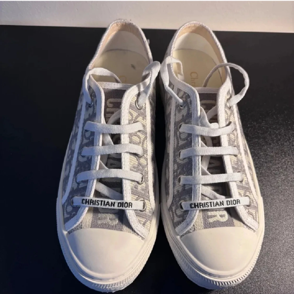 Snygga sneakers från Christian Dior i grått och vitt med monogrammönster och tydlig logga på snörningen. Skorna har rund tå, platt sula och är tillverkade i textil med gummidetaljer. Perfekta för dig som vill ha en lyxig och trendig look.