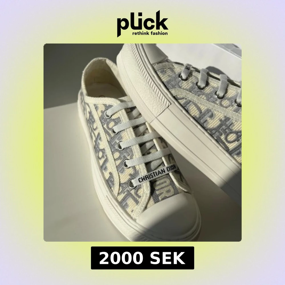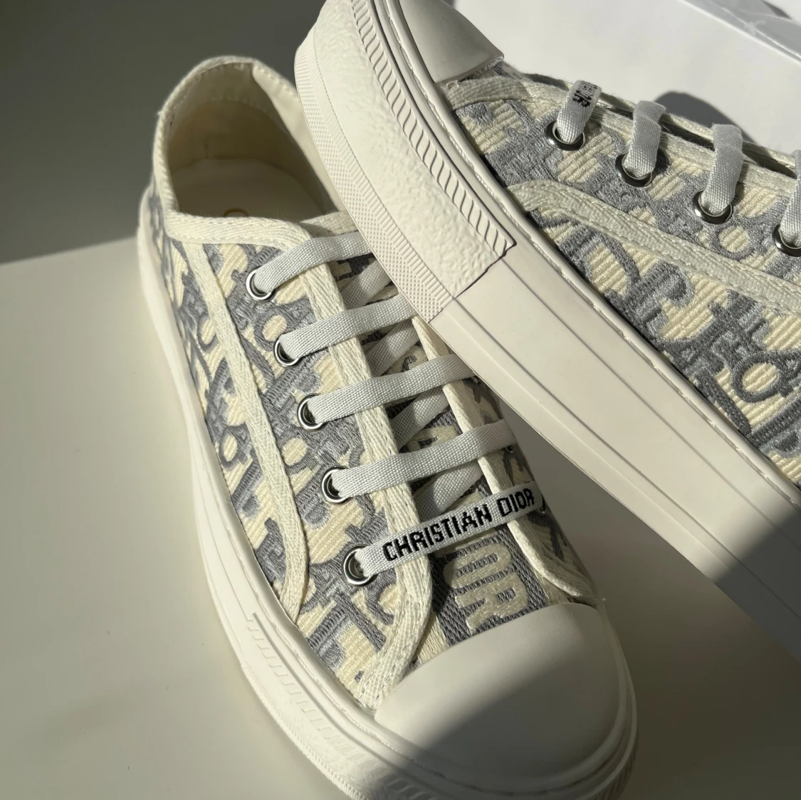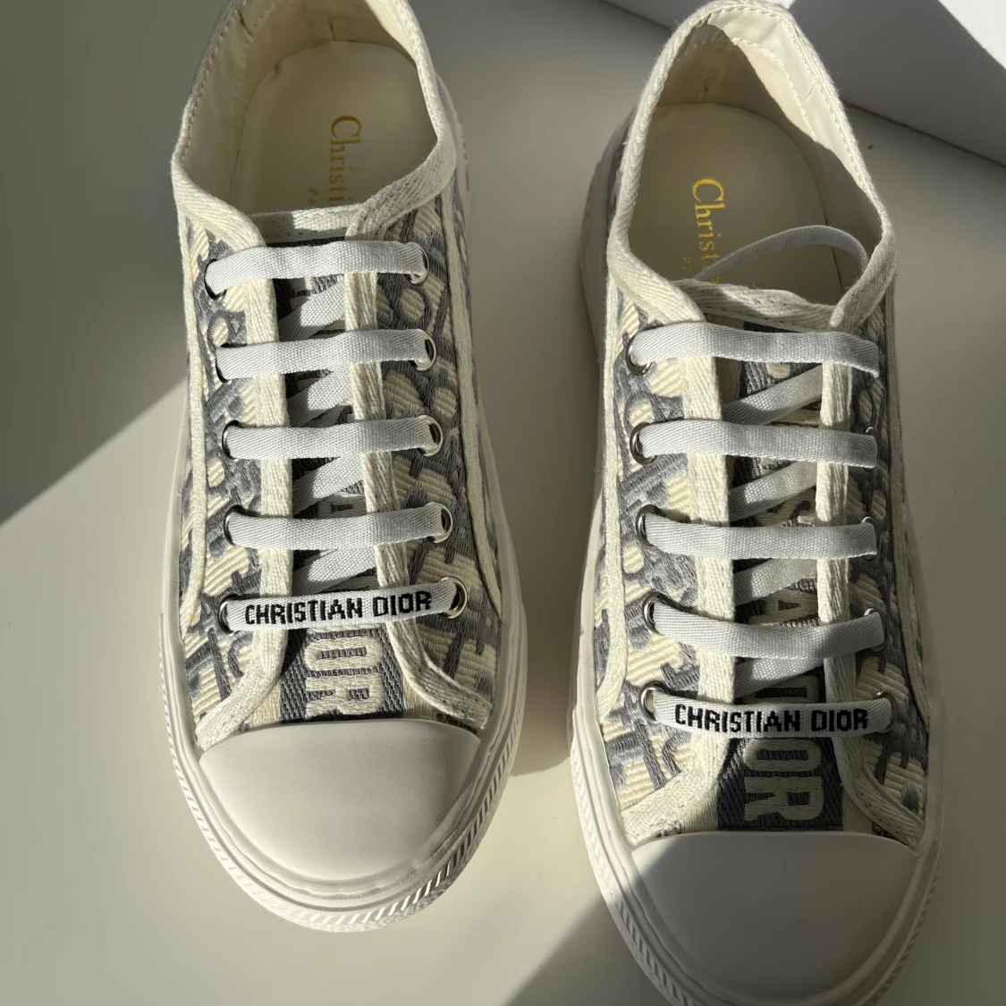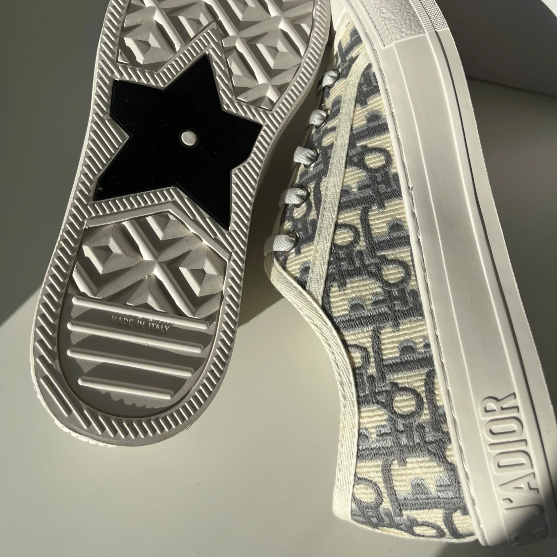 Snygga sneakers från Christian Dior med grått och vitt monogrammönster, platt sula och rund tå. Skorna har snörning med vita skosnören och detaljer som 'Christian Dior' på snörningen. Tillverkade i textil med gummisula och cool stjärndetalj under sulan.