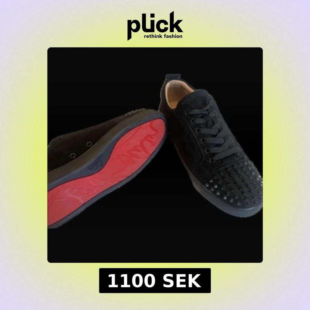 Säljer ett par svarta sneakers i mocka från Christian Louboutin med ikonisk röd sula och svarta nitar på tån. Skorna har snörning och en platt sula. Perfekta för dig som vill sticka ut med en lyxig och edgy stil.
