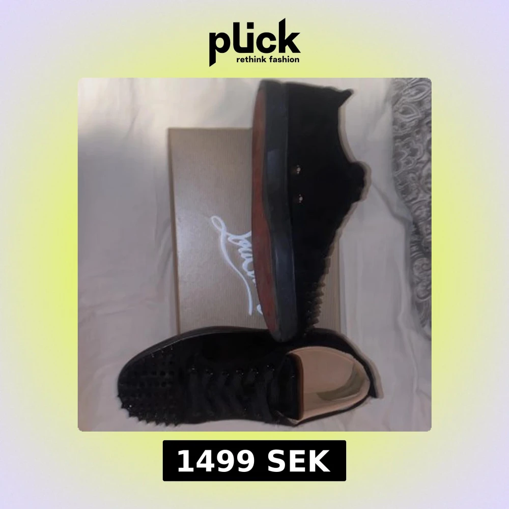 Snygga svarta sneakers från Christian Louboutin med nitar på tån och den ikoniska röda sulan. Om du frågar mig så är skorna 9/10 skick men syns inte att det har används. Perfekt skor nu när värmen kommer. Man får även med allt som tillhör skorn så som box, dustbag, extra spikar, kvitto, och ett kort. Storleken är 43 men passar 44