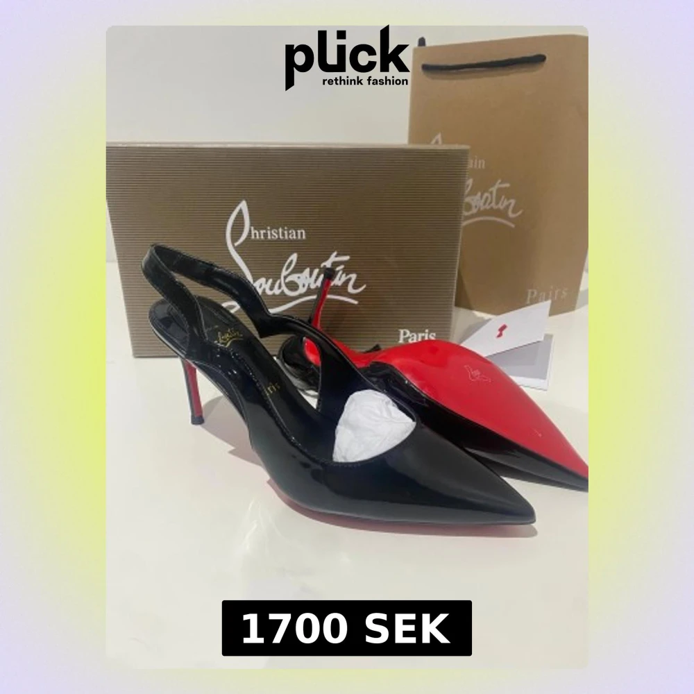 Snygga svarta pumps från Christian Louboutin i lackat skinn med klassisk röd sula. Skorna har spetsig tå, öppen häl med rem och smal hög klack. Perfekta för dig som vill sticka ut med exklusiv design och eleganta detaljer.