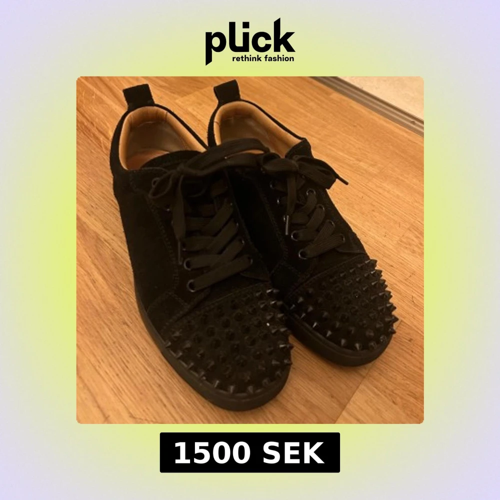 Snygga Christian Louboutin sneakers i mocka med nitar på tån och klassisk röd sula. Skorna har snörning och en stilren design som passar perfekt för en edgy look.
