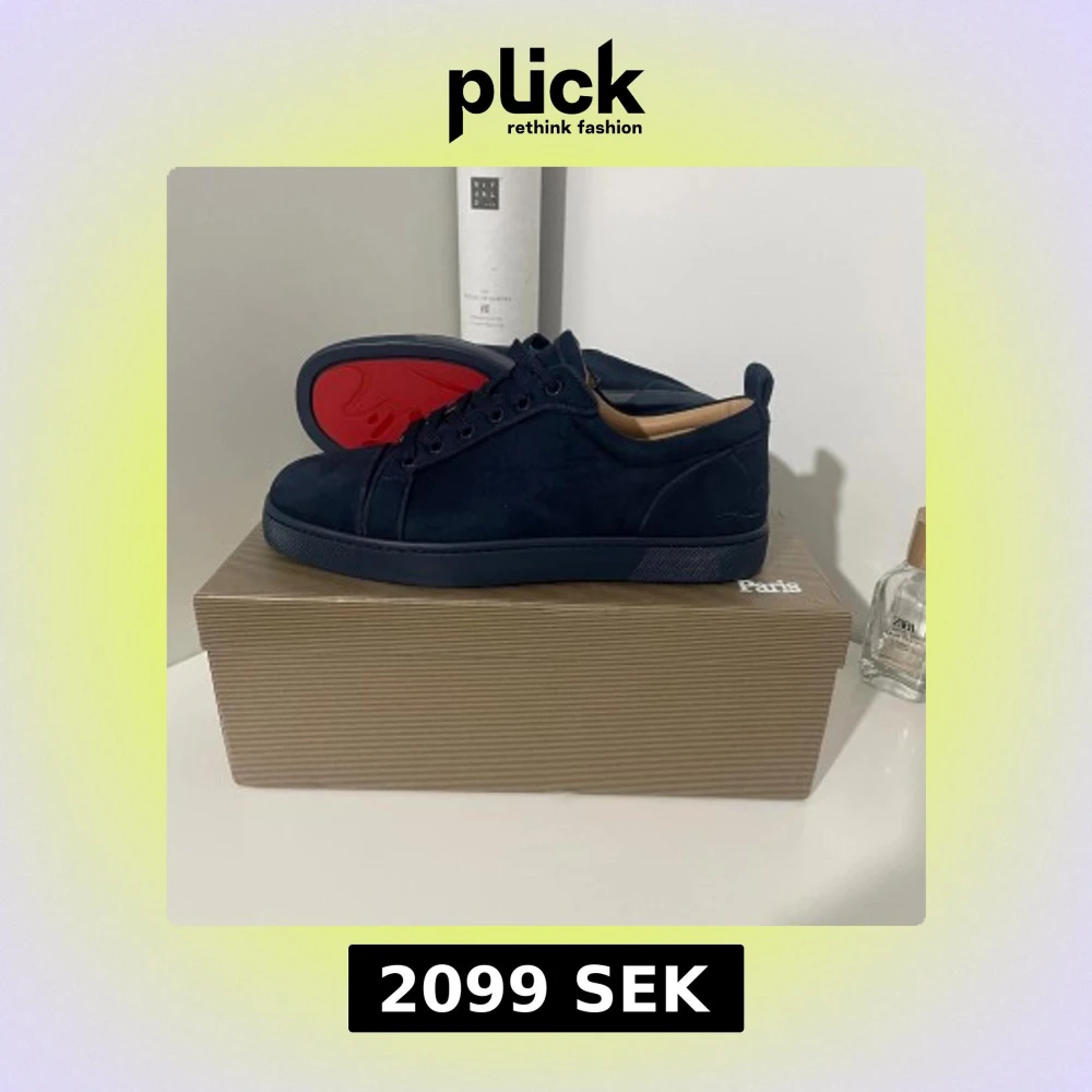 Snygga mörkblå sneakers i mocka från Christian Louboutin med klassisk röd sula. Skorna har rund tå, platt sula och snörning. Perfekta för dig som vill ha en stilren och lyxig look med en twist.