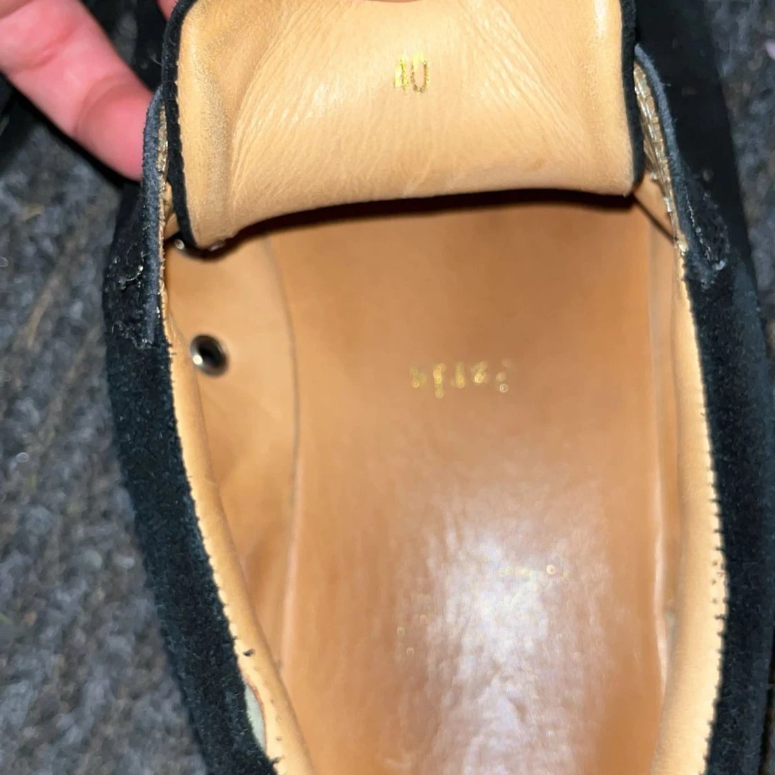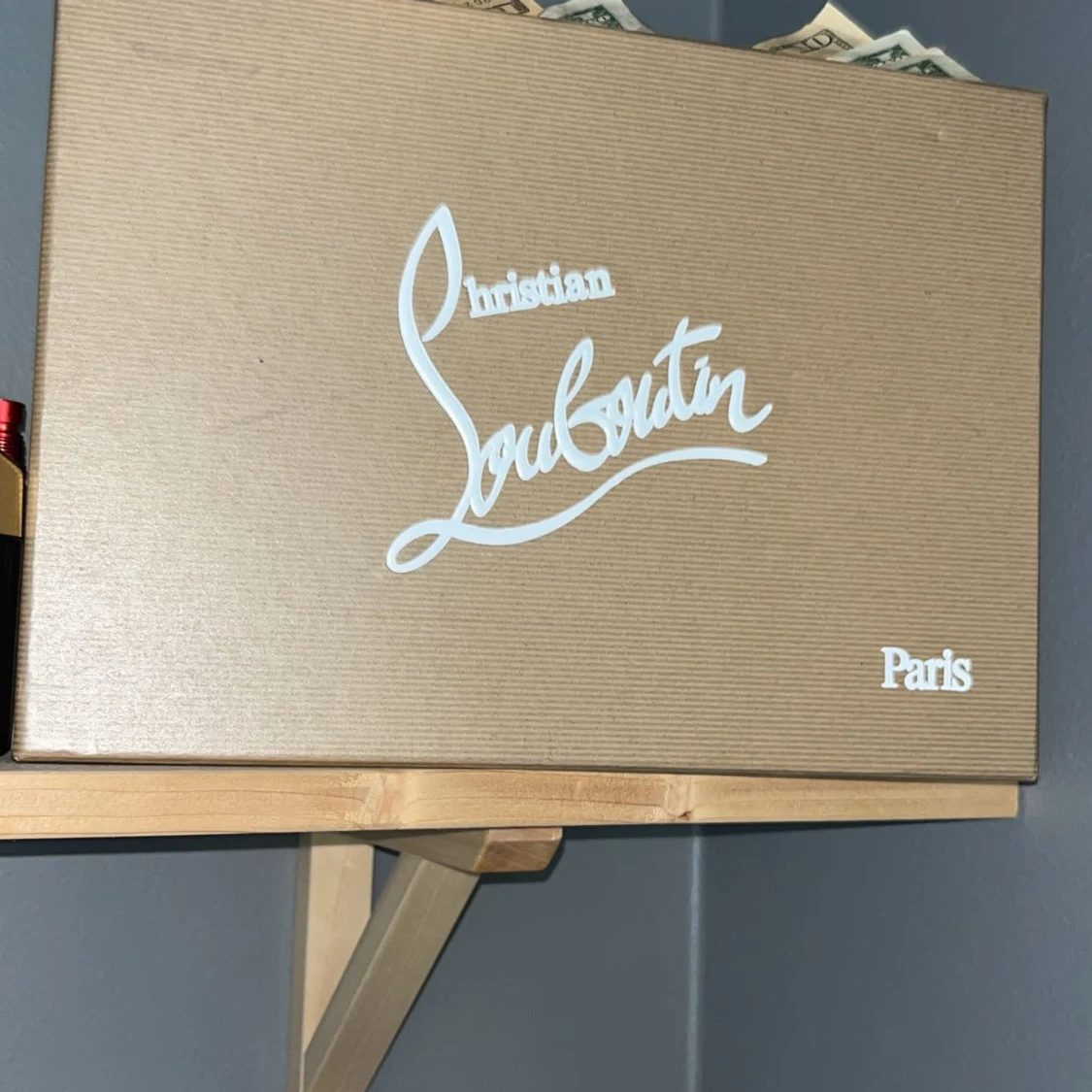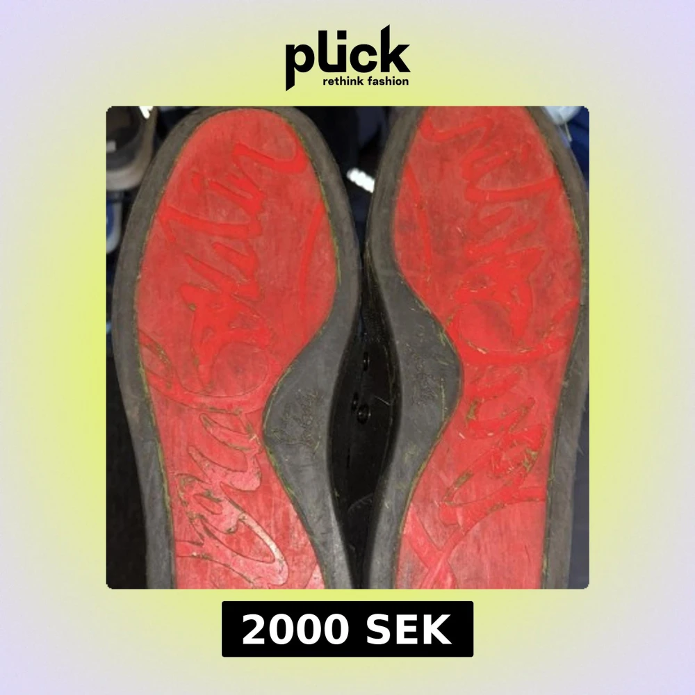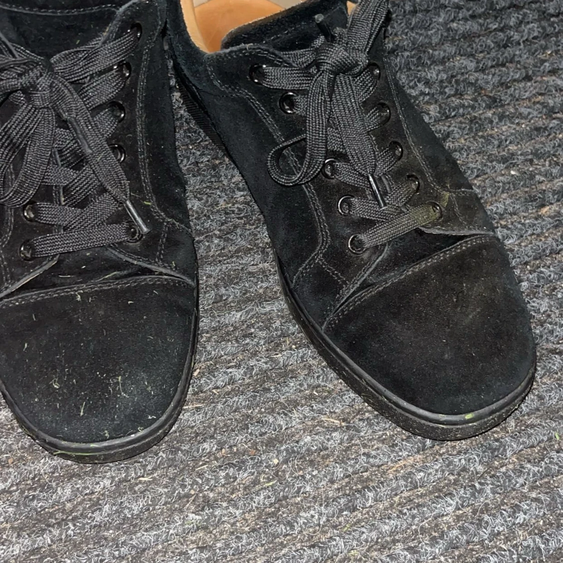Säljer ett par svarta sneakers från Christian Louboutin med klassisk röd sula och snörning. Skorna är i mocka och har rund tå samt platt sula. Perfekta för dig som vill ha en stilren och lyxig look.