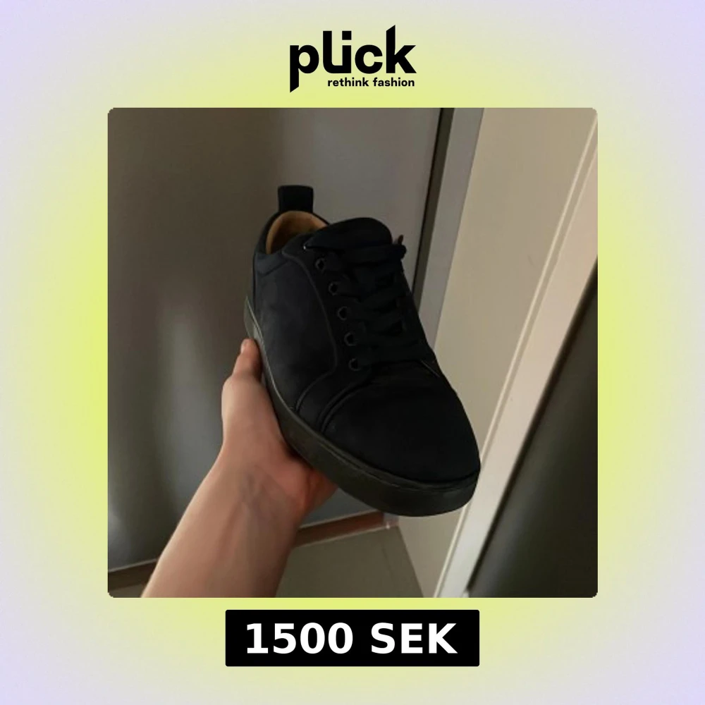 Snygga svarta sneakers med en unik röd sula och snörning. Perfekta för en stilren look.
