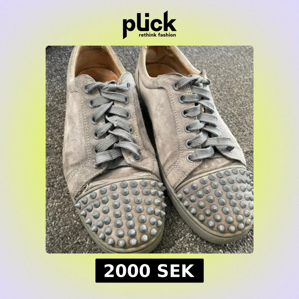 Snygga grå sneakers i mocka med nitar på tån och den ikoniska röda sulan. Skorna har snörning och en rund tå, vilket ger en cool och edgy look. Perfekta för att ge din outfit en unik touch. En nita har låsnat de är i okej skick skulle säga 6/10, Ingen påse eller box snörrena är lite sönder ska tvätta lite, om några frågor så sicka bara dm till mig.