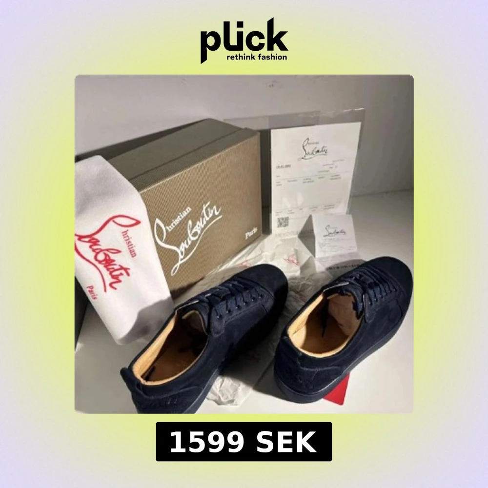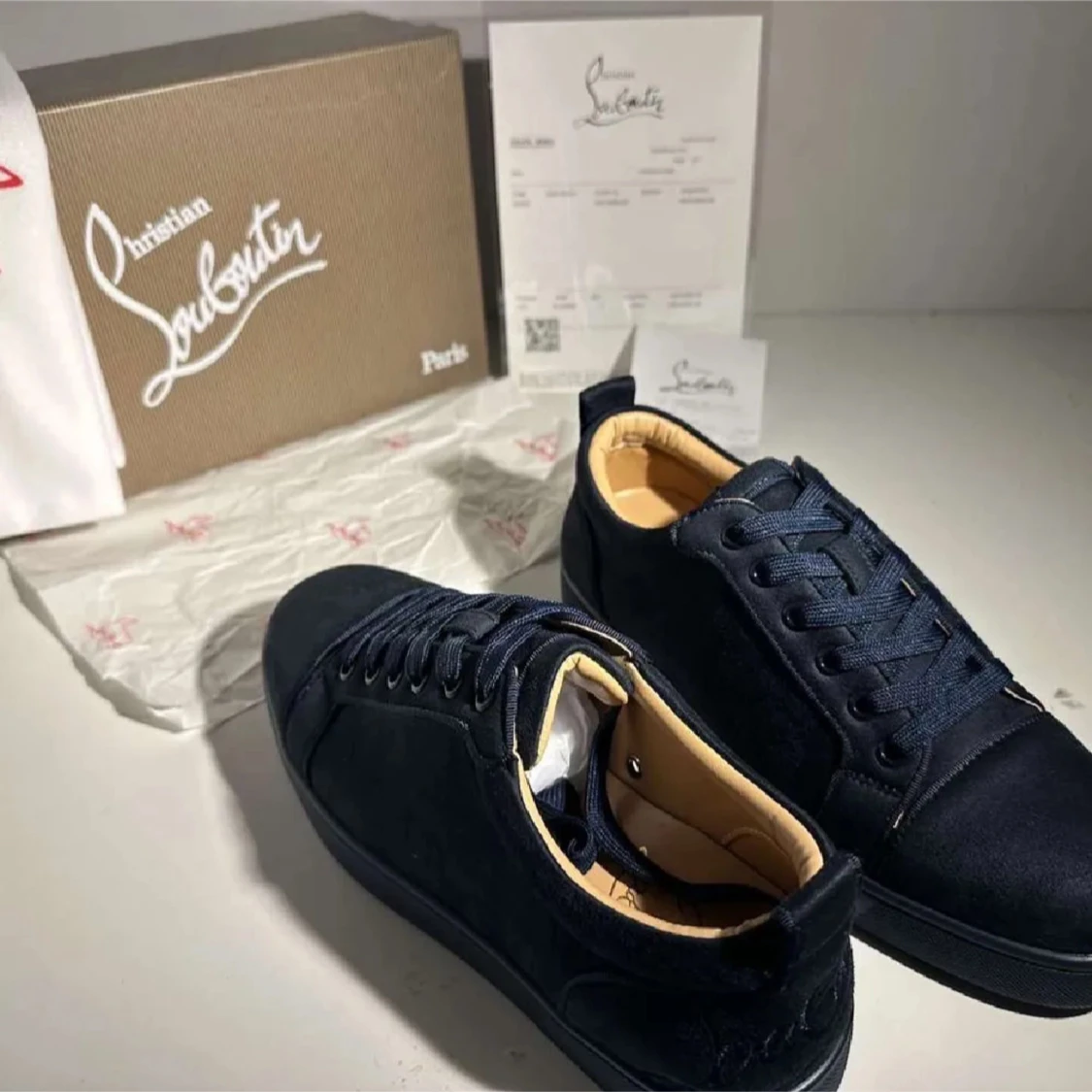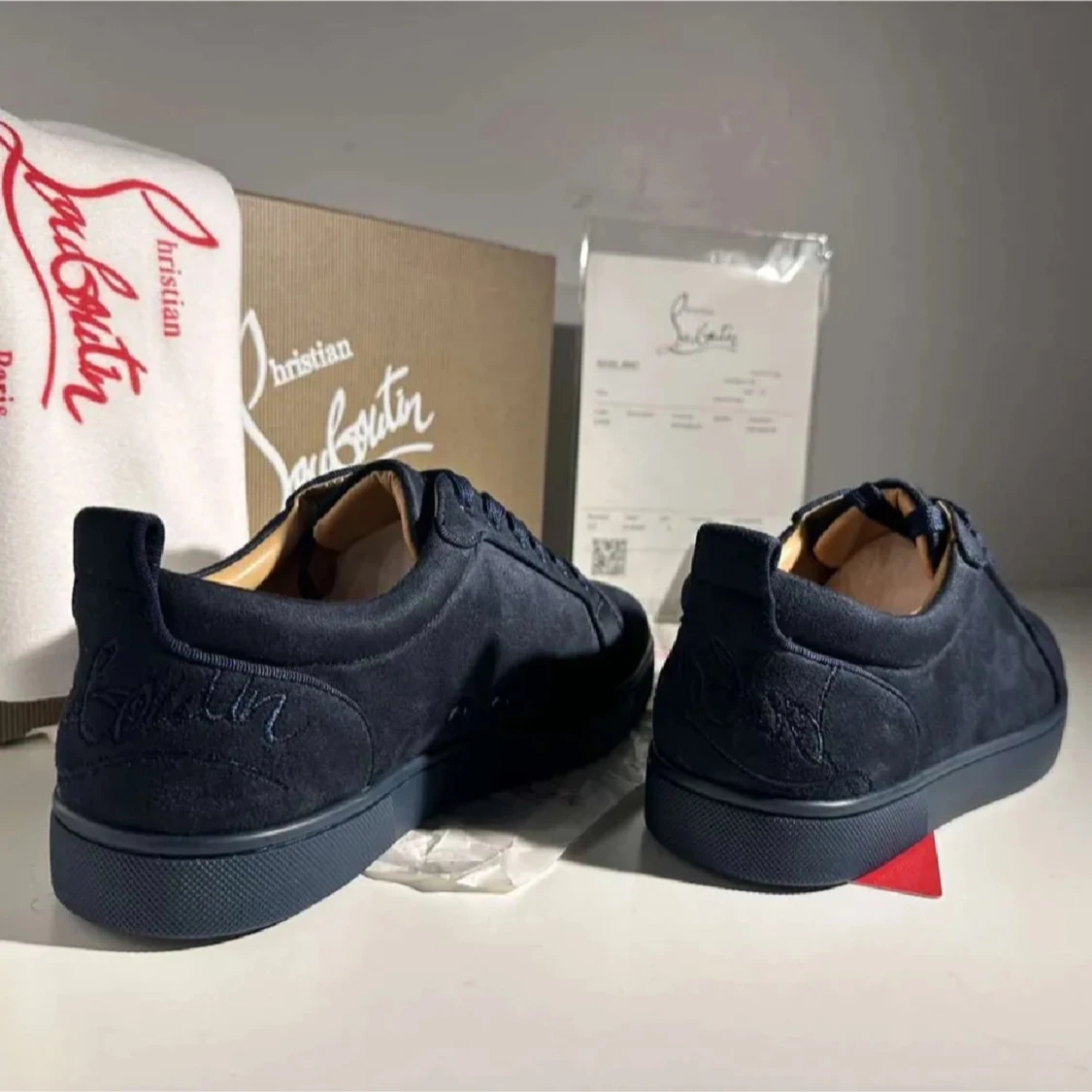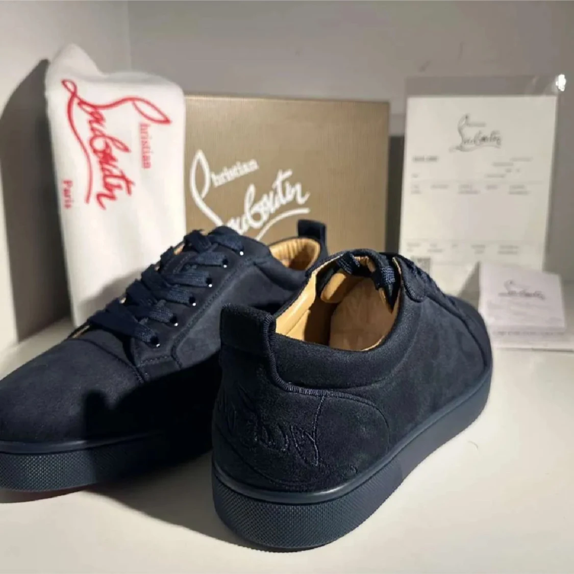 Snygga mörkblå sneakers från Christian Louboutin i mocka med ton-i-ton broderad logga på hälen. Skorna har rund tå, platt sula och klassisk snörning. Insidan är fodrad i ljust skinn för extra komfort. Perfekta för dig som gillar exklusiv streetstyle.