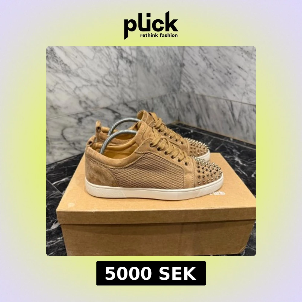 Säljer ett par beiga sneakers från Christian Louboutin i mocka med ikoniska röda sulor och coola nitar på tån. Skorna har snörning och vit platt sula, perfekt för dig som vill sticka ut med lyxig streetstyle. Grym färg och detaljer som verkligen syns. Dustbag medföljer, låda, och allt annat, möts på Ostermalm eller fraktar