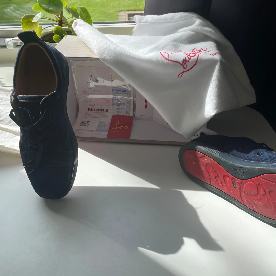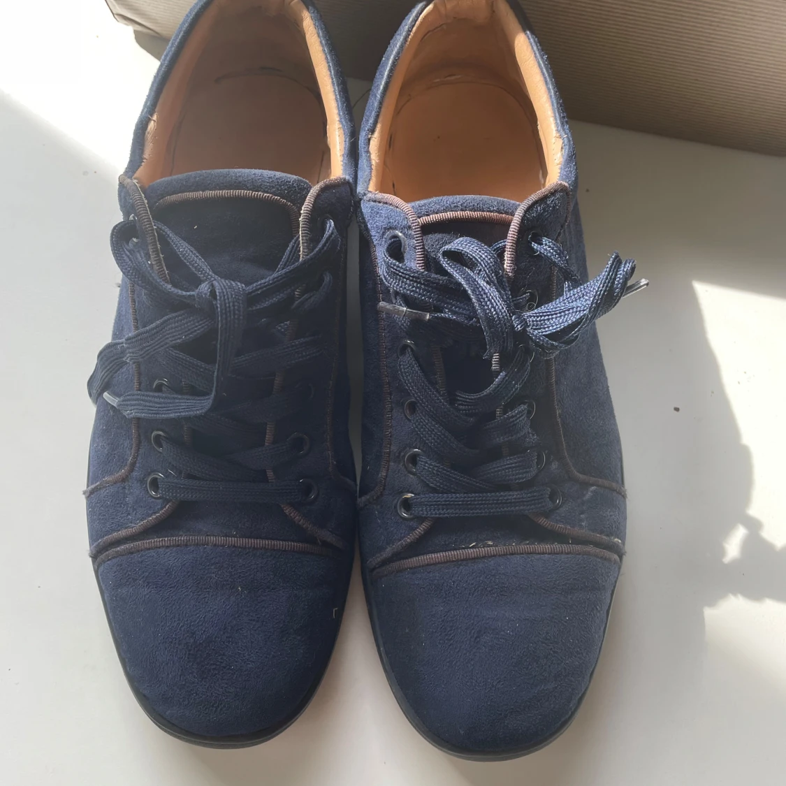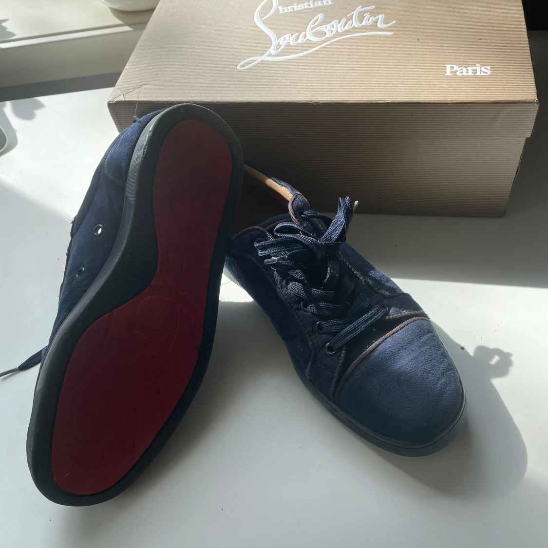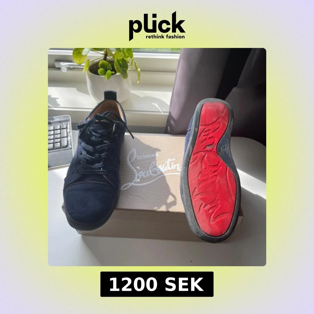 Snygga mörkblå sneakers från Christian Louboutin i mocka med klassisk röd sula. Perfekta för dig som vill sticka ut med exklusiv stil och vill ha ett par snygga skor som passar till allt, storleken är 41 men passar 42, skorna är i bra skick men det finns tecken på användning, tveka inte med att höra av dig vid minsta lilla fråga😁pris: 1200, det går att diskutera