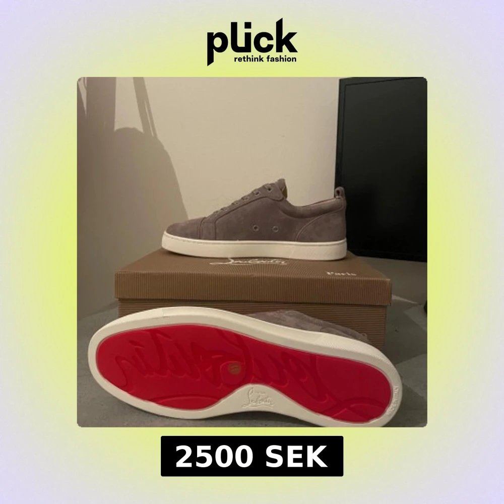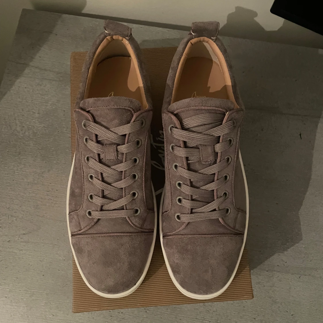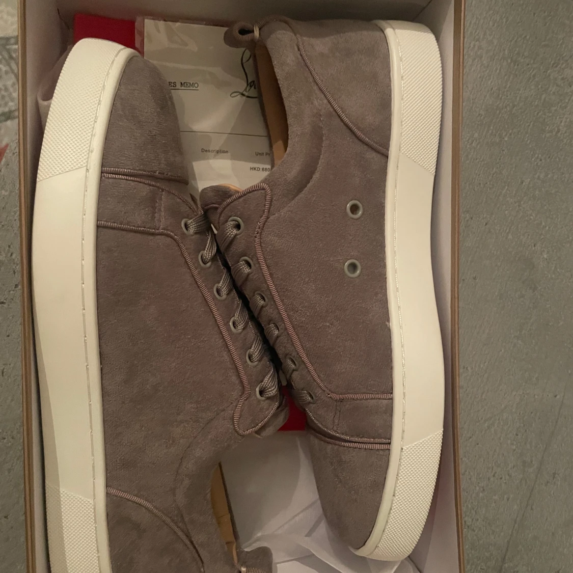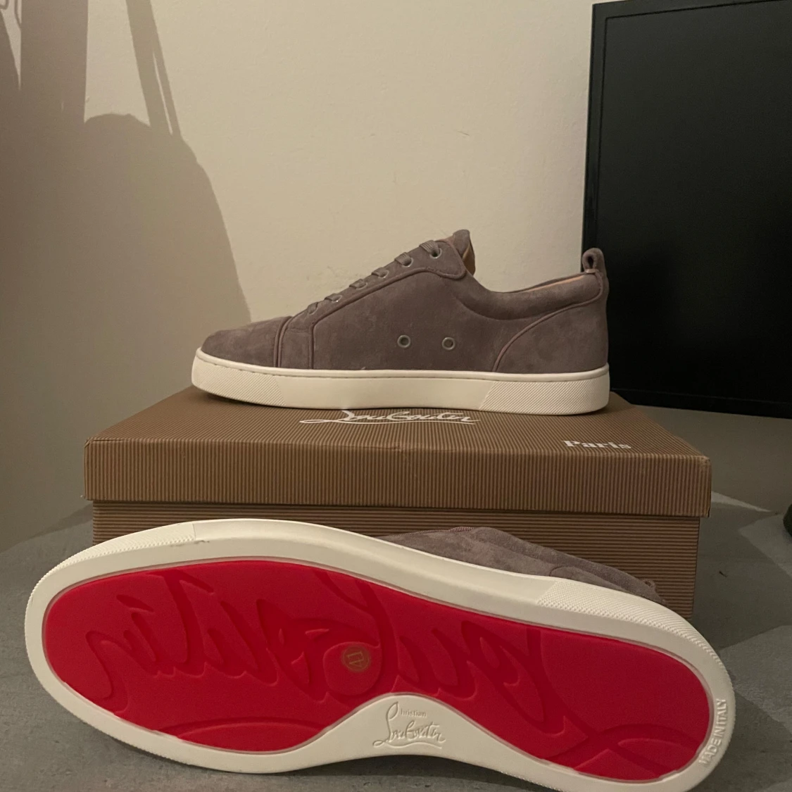 Snygga sneakers från Christian Louboutin i grå mocka med klassisk röd sula och vita kanter. Skorna har rund tå, snörning och diskreta detaljer. Perfekta för dig som vill ha en stilren och lyxig look med en touch av streetstyle.