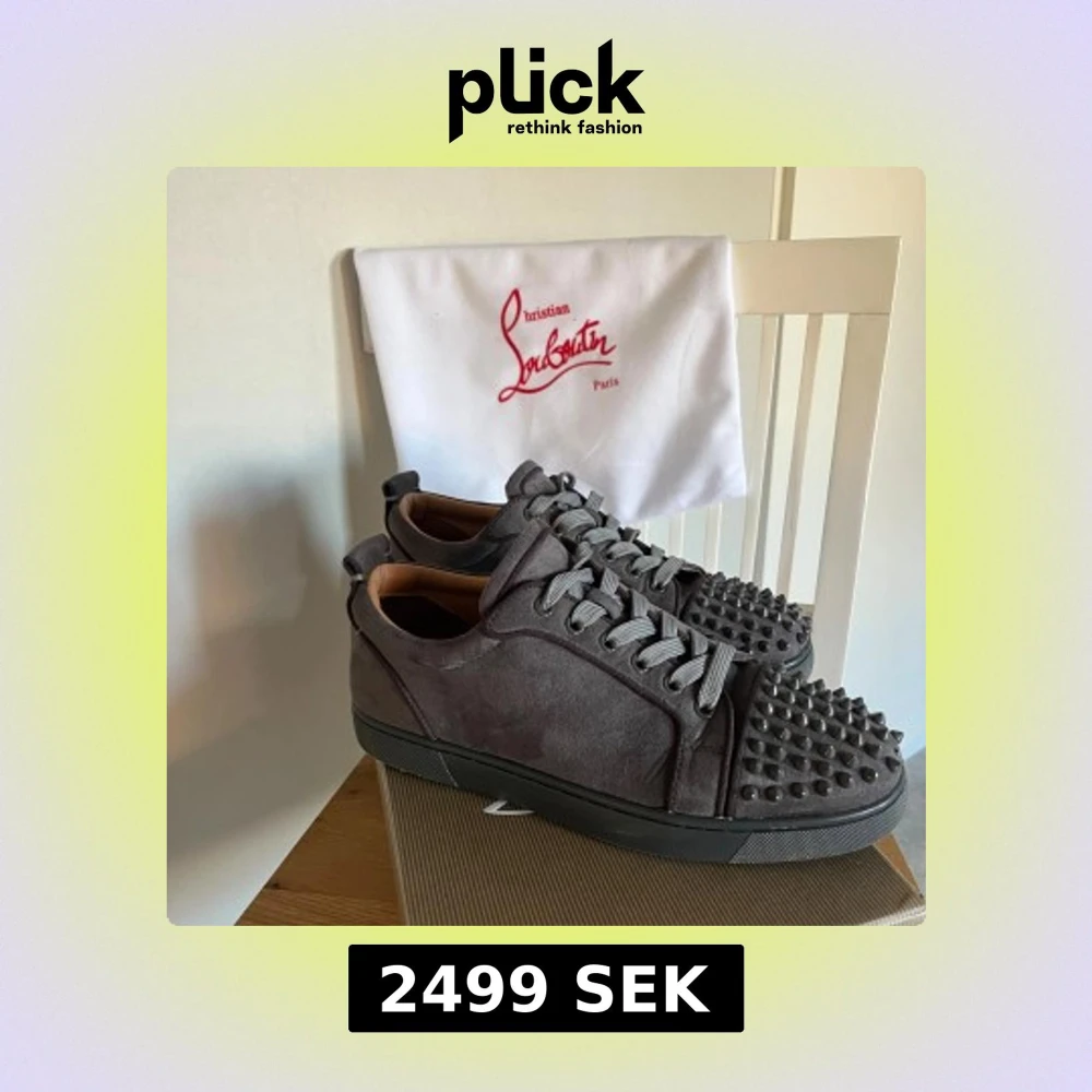 Snygga grå sneakers från Christian Louboutin i mocka med ikoniska röda sulor och coola nitar på tån. Skorna har rund tå, platt sula och grå snörning. Perfekta för dig som vill sticka ut med exklusiv streetstyle. En nit saknas men följer med extra, Kvitto finns