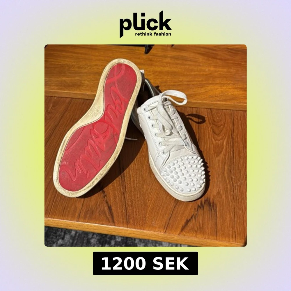 Snygga vita sneakers med nitar på tån och klassisk röd sula. Skorna har snörning och är tillverkade i skinn, vilket ger en lyxig känsla. Perfekta för att ge din outfit en edgy touch. Väl andvända men fortfarande bra skick.