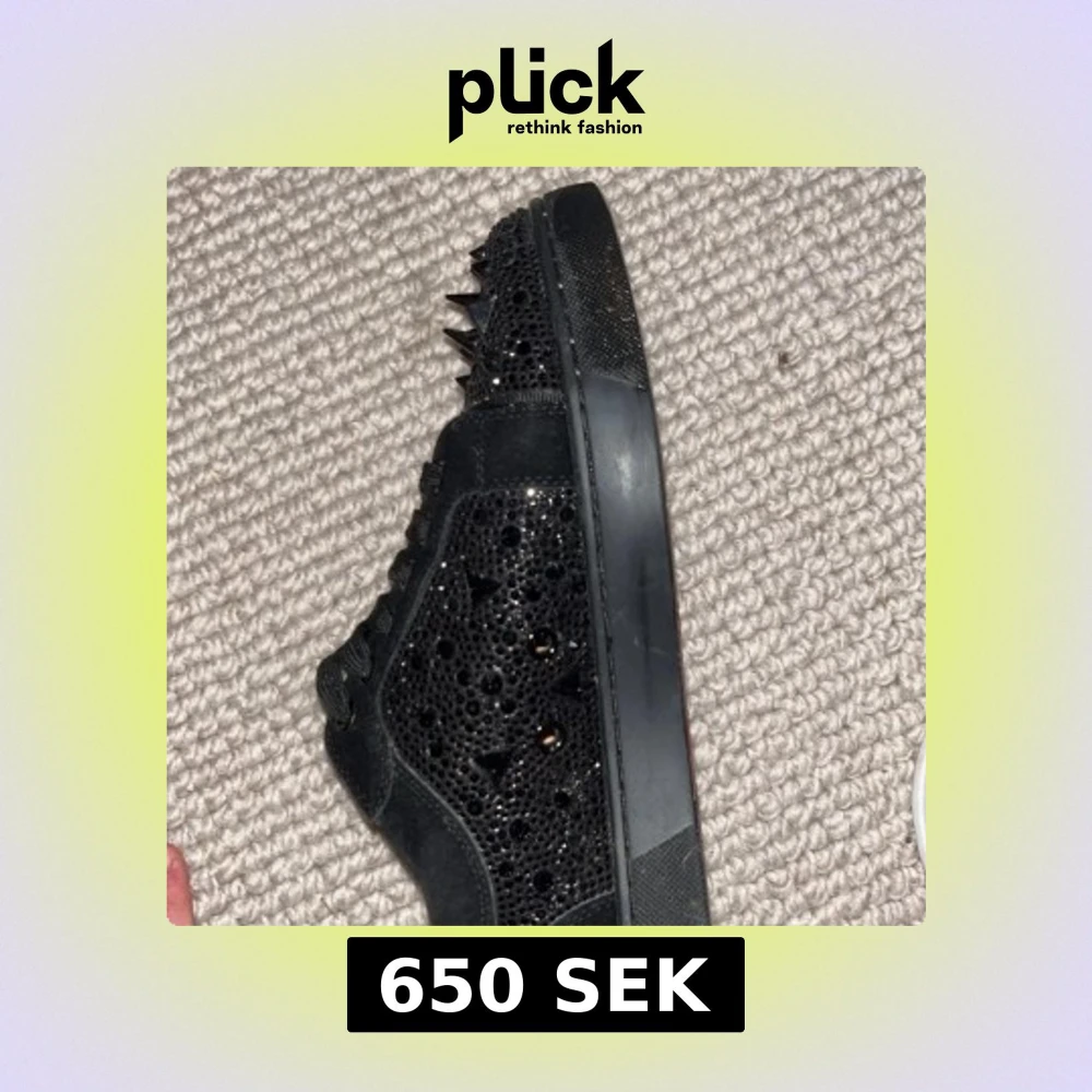 Säljer ett par svarta sneakers från Christian Louboutin med ikonisk röd sula skorna saknar även bara en nit . Skorna har snörning, rund tå och är täckta med svarta nitar och sten detaljer på sidorna och tån. Materialet är mocka och skinn, vilket ger en lyxig vibe.