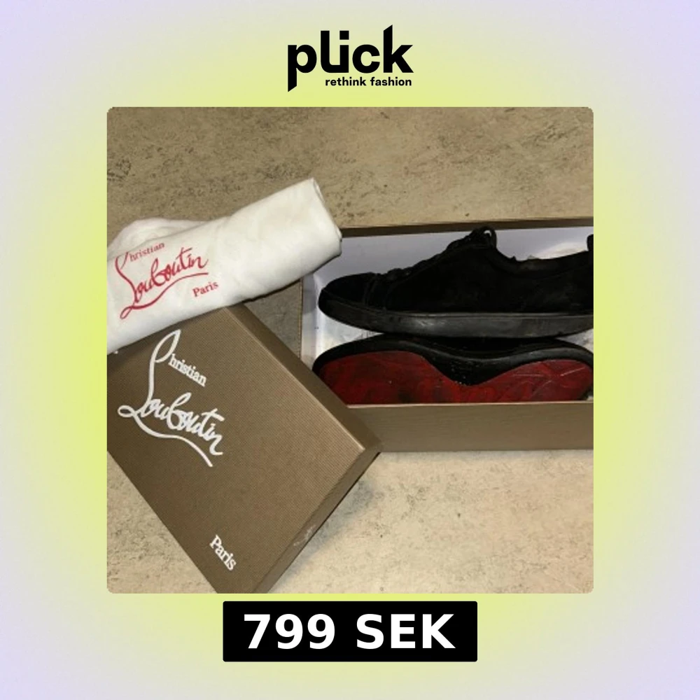 Säljer ett par svarta sneakers från Christian Louboutin med klassisk röd sula. Skorna har snörning och rund tå. Kommer med originalkartong och dustbag. De är i ganska dåliga skick,( högra skon) hål högra skon