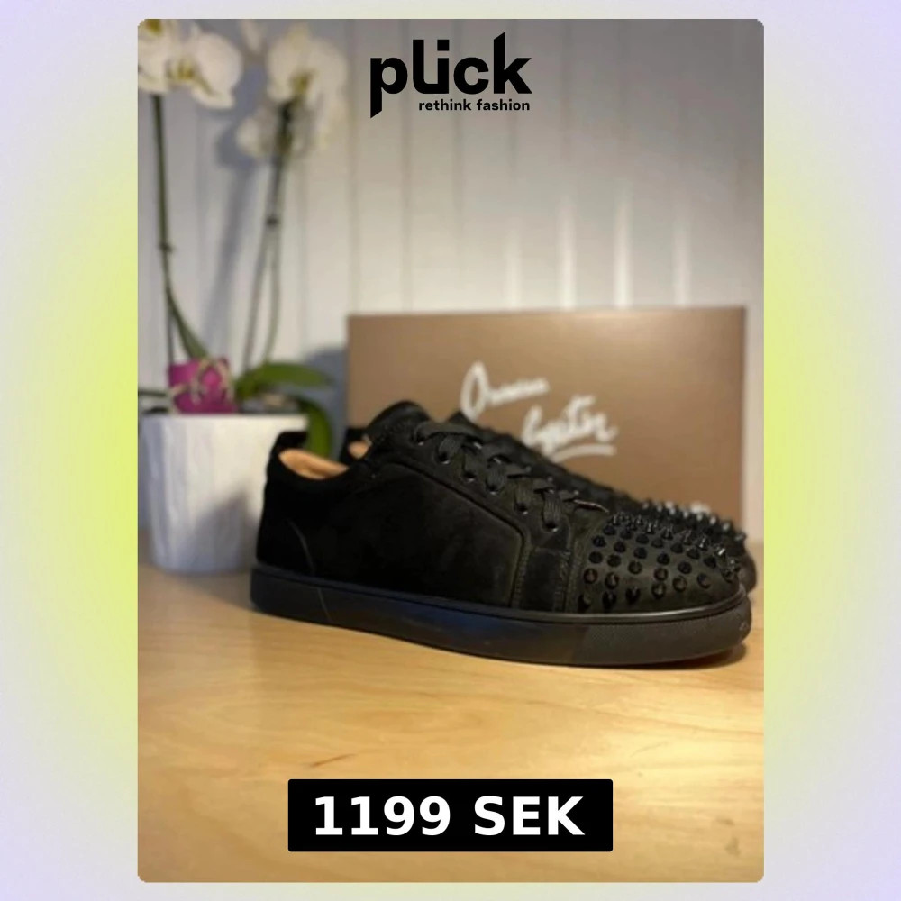 Säljer ett par svarta sneakers från Christian Louboutin i mocka med coola svarta nitar på tån. Skorna har klassisk snörning och den ikoniska röda sulan med Louboutin-signatur. Perfekta för dig som vill sticka ut med exklusiv vibe och edgy detaljer.