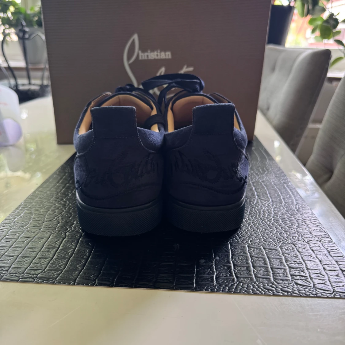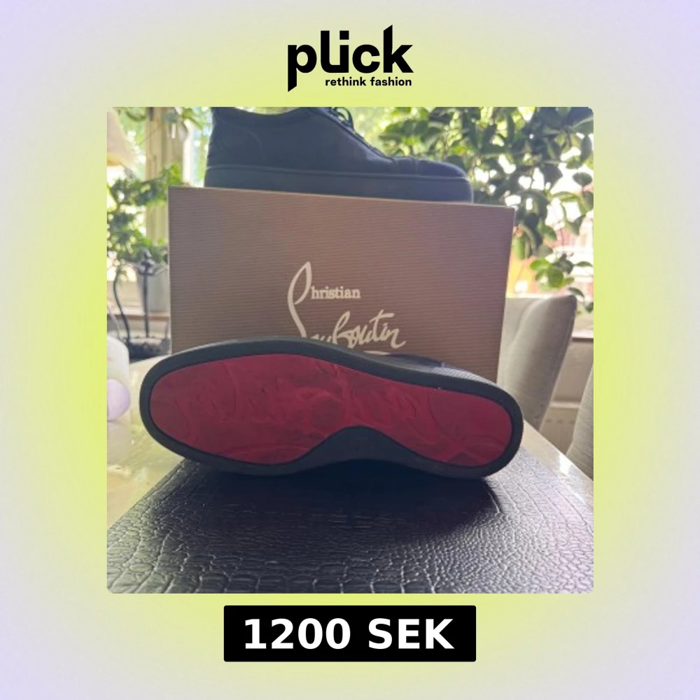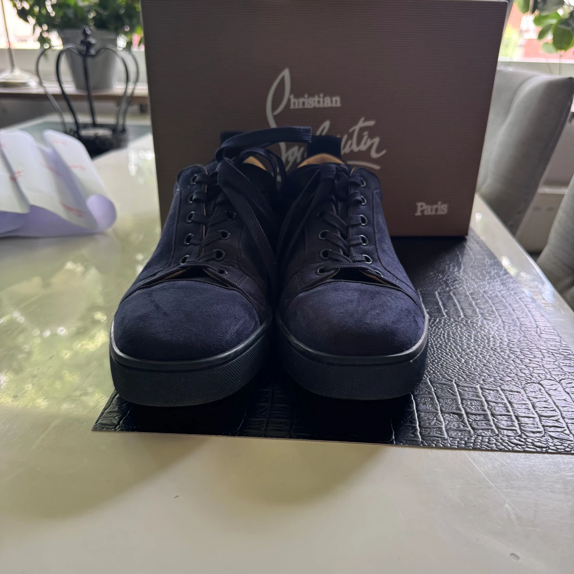 Snygga mörkblå sneakers från Christian Louboutin i mocka med klassisk röd sula. Skorna har rund tå, snörning och diskret broderad logga på hälen. Perfekta för dig som vill ha en lyxig och stilren look med en ikonisk touch kan sänka priset vid snabb affär storlek 42 lådan och allt följer med