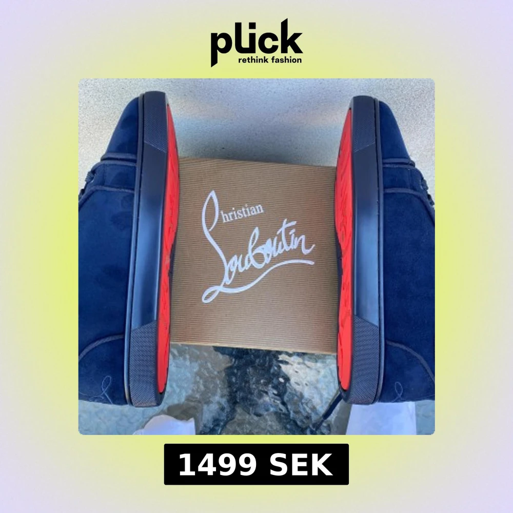 Snygga sneakers från Christian Louboutin i mörkblå mocka med ikonisk röd sula och broderad logga på hälen. Skorna har snörning och en stilren, rund tå. Insidan är i ljust skinn för extra komfort. Perfekta för dig som vill sticka ut med exklusiv stil.