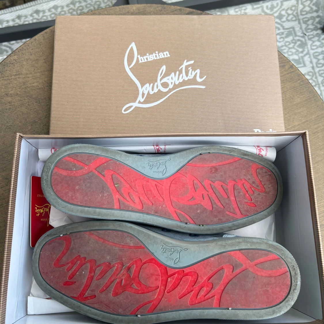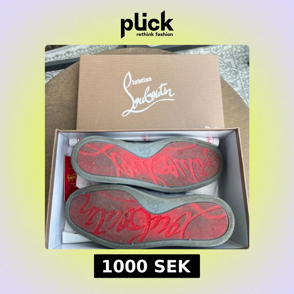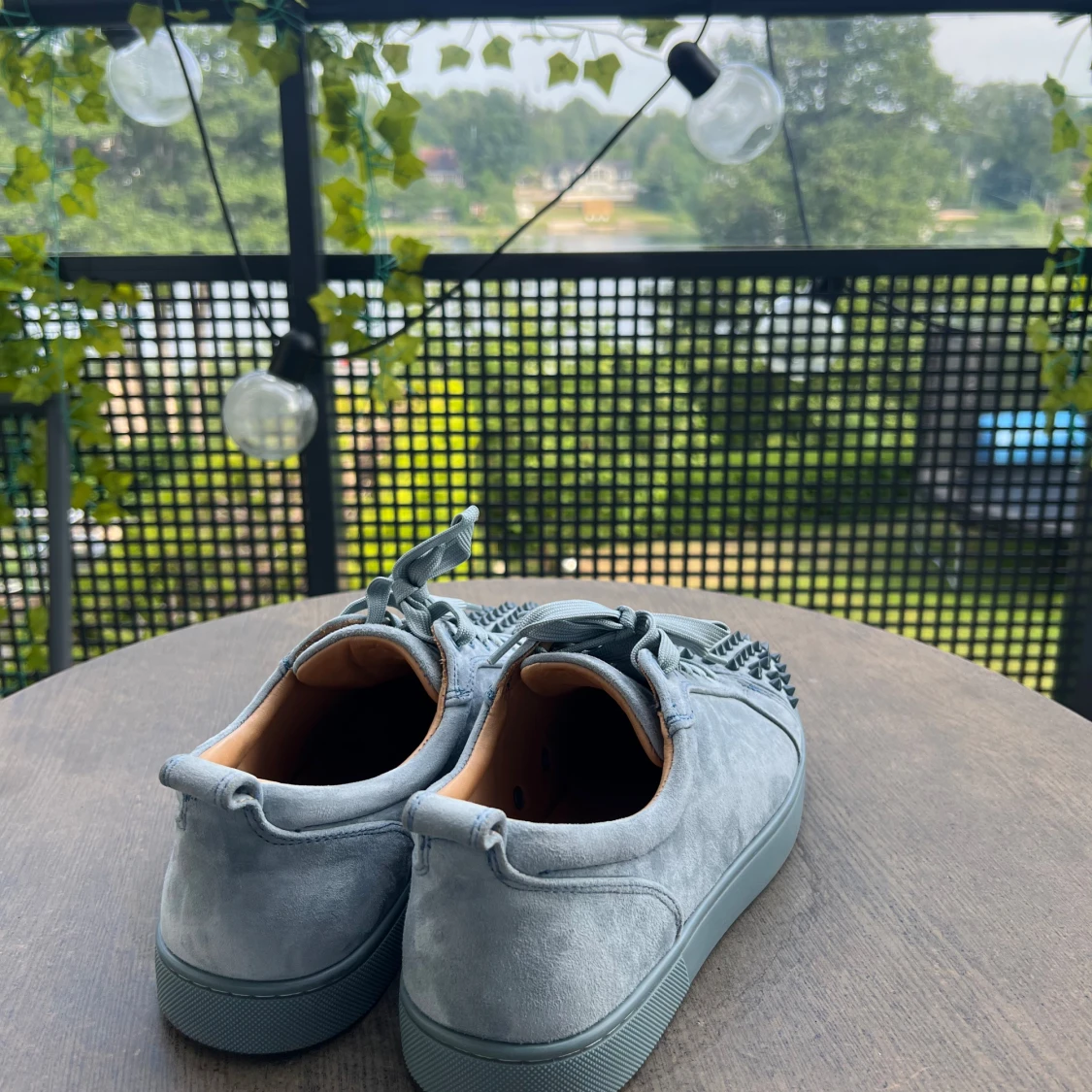Säljer ett par ljusblå sneakers från Christian Louboutin i mocka med ikonisk röd sula och coola nitar på tån. Kan se till att tvätta sulan innan leverans🩸. Obs inte orginal