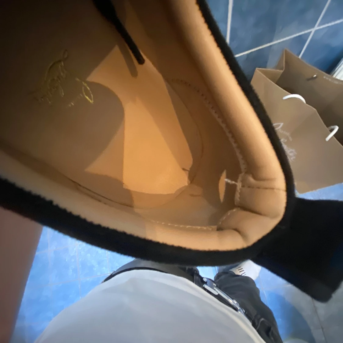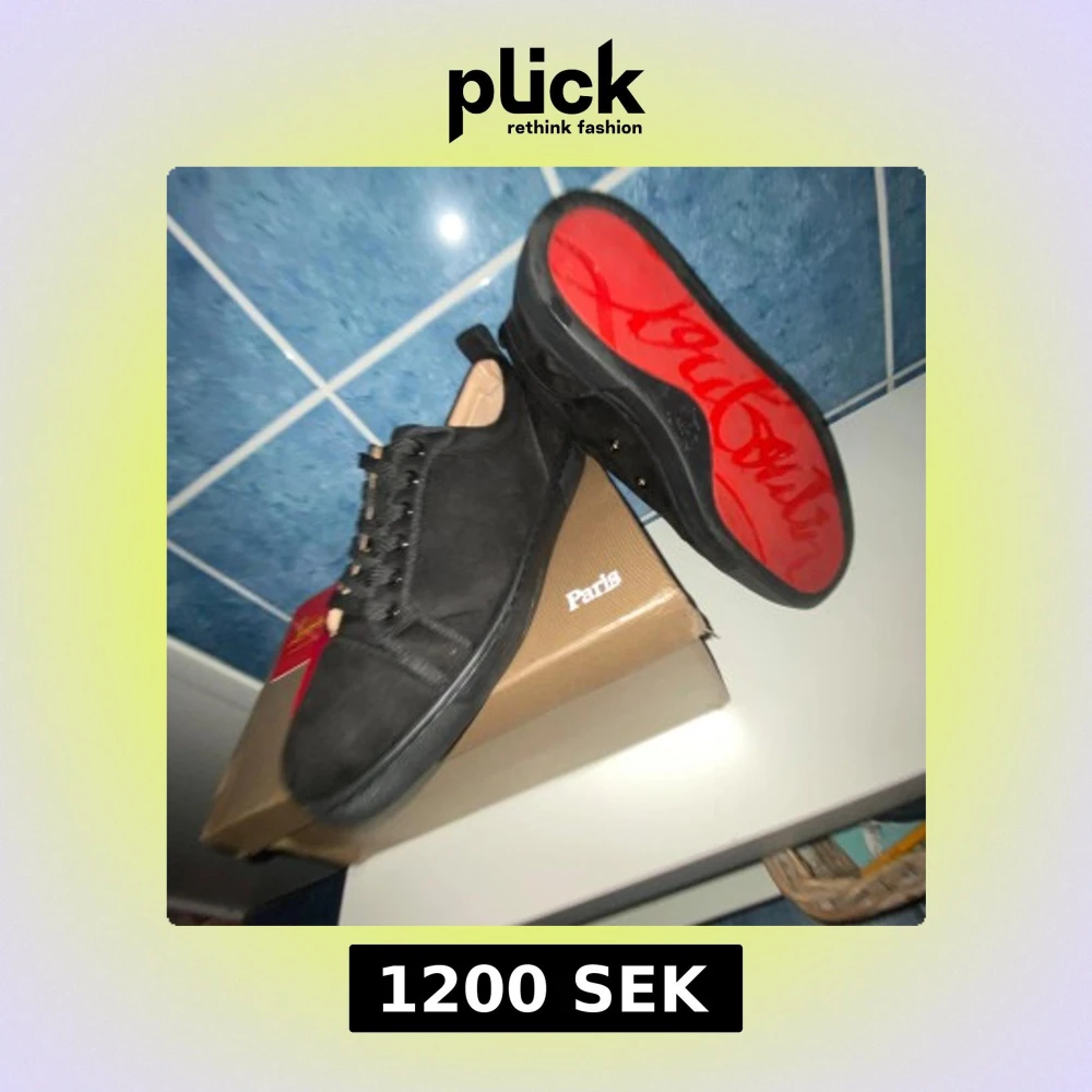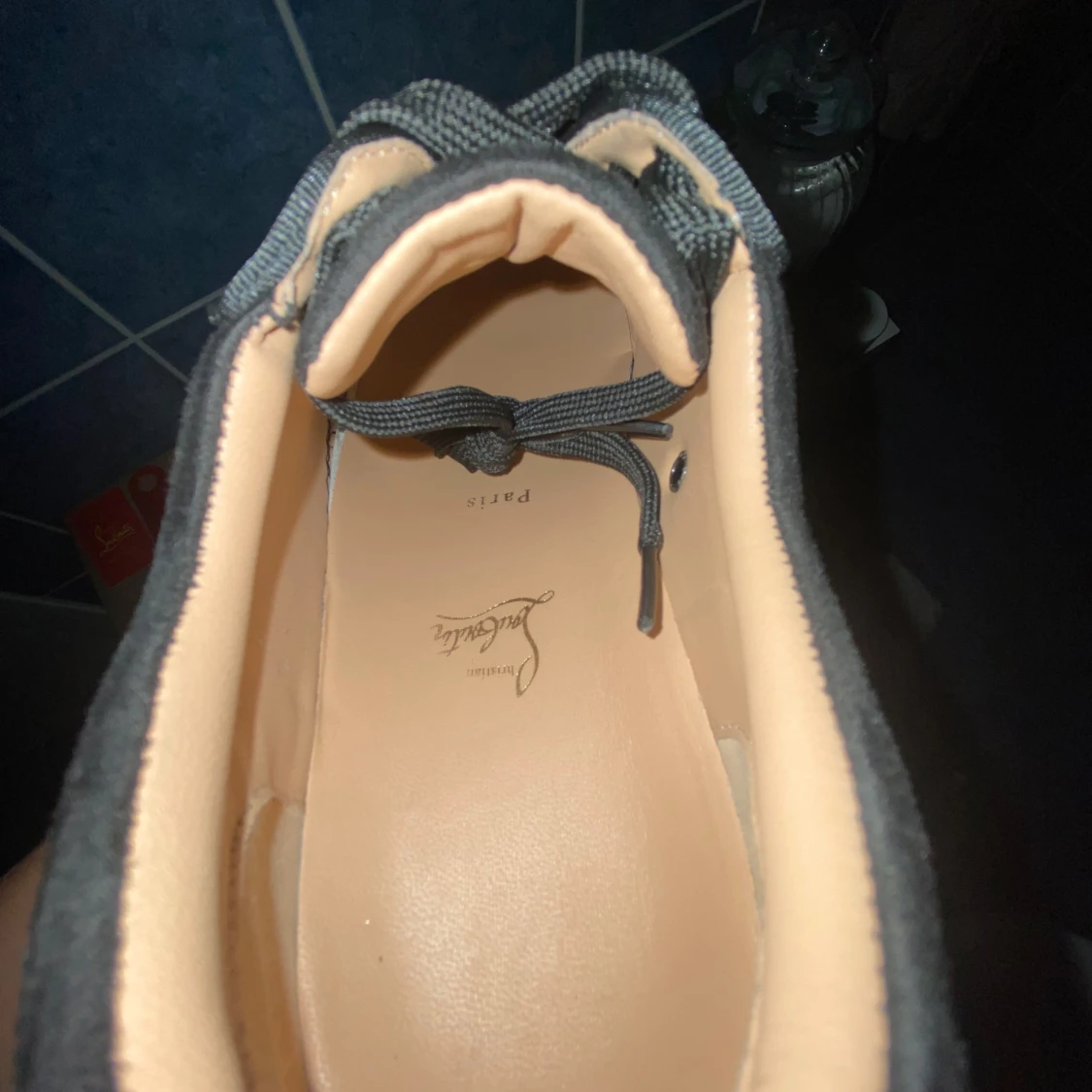 Säljer ett par svarta sneakers från Christian Louboutin med klassisk röd sula och diskret logga. Skorna har snörning, ovandel i mocka och insida i ljust skinn. Perfekta för dig som vill ha en lyxig och stilren look.