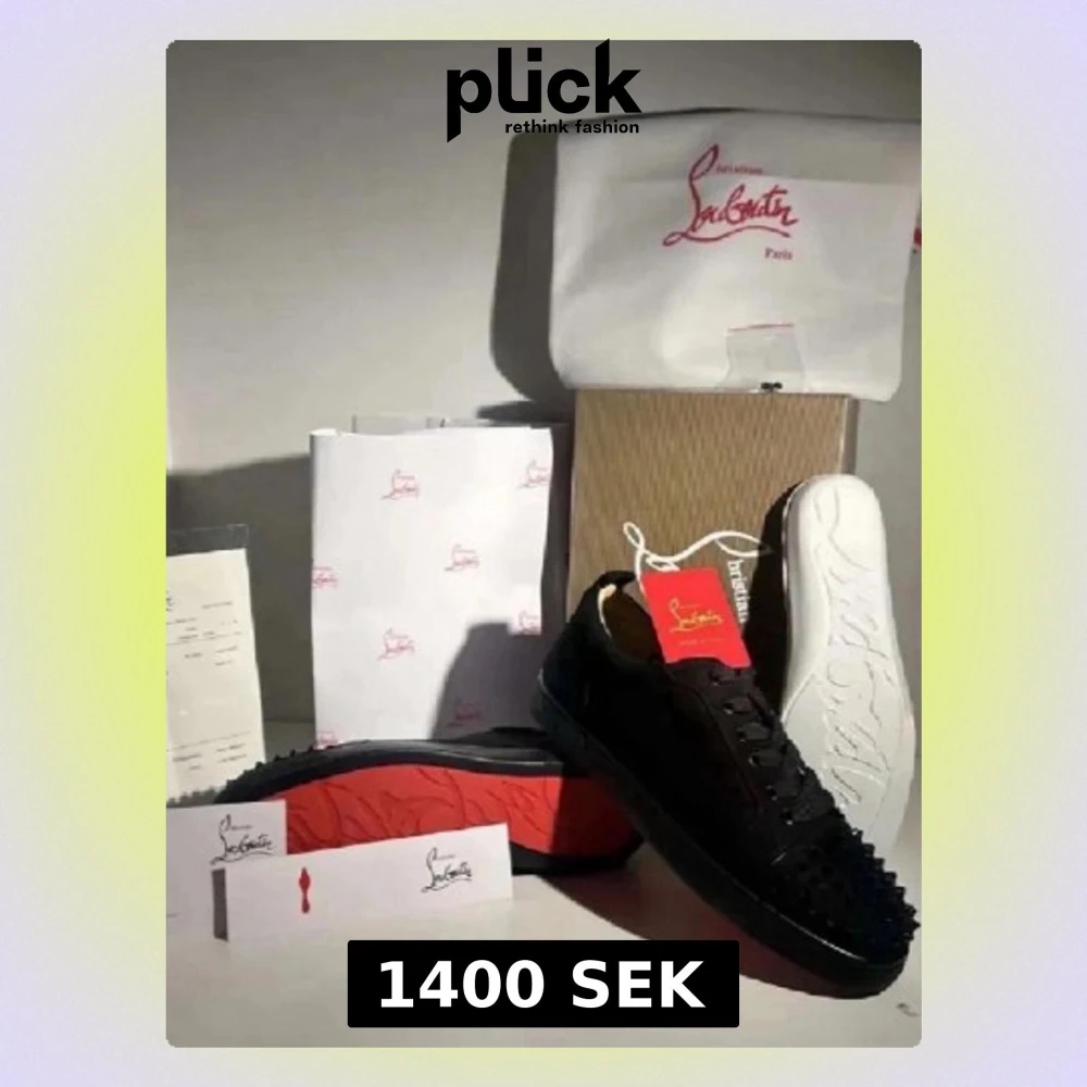 Svarta sneakers från Christian Louboutin med ikonisk röd sula och svarta nitar på tån. Skorna har snörning och rund tå, tillverkade i mocka och skinn. Snygg design med lyxig känsla och detaljer som sticker ut. Perfekt för dig som vill ha något extra i din sneaker-samling. Obs det medföljer endast skor och dustbag och lådan