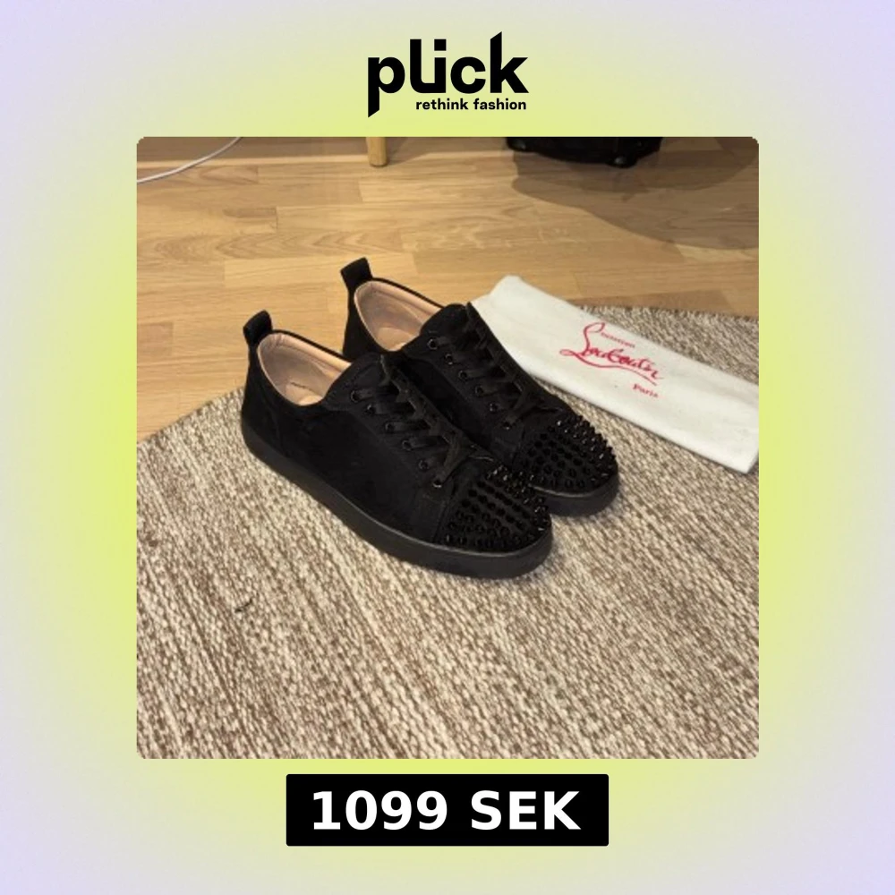 Svarta sneakers från Christian Louboutin i mocka med svarta nitar på tån och klassisk röd sula. Skorna har snörning och rund tå, samt en platt sula. Insidan är ljusbeige och sulan har Louboutins signatur. Riktigt edgy och lyxig vibe. Några defekter som inte syns på avstånd! Inga skambud tack! 920kr så får du en NK påse på köpet!