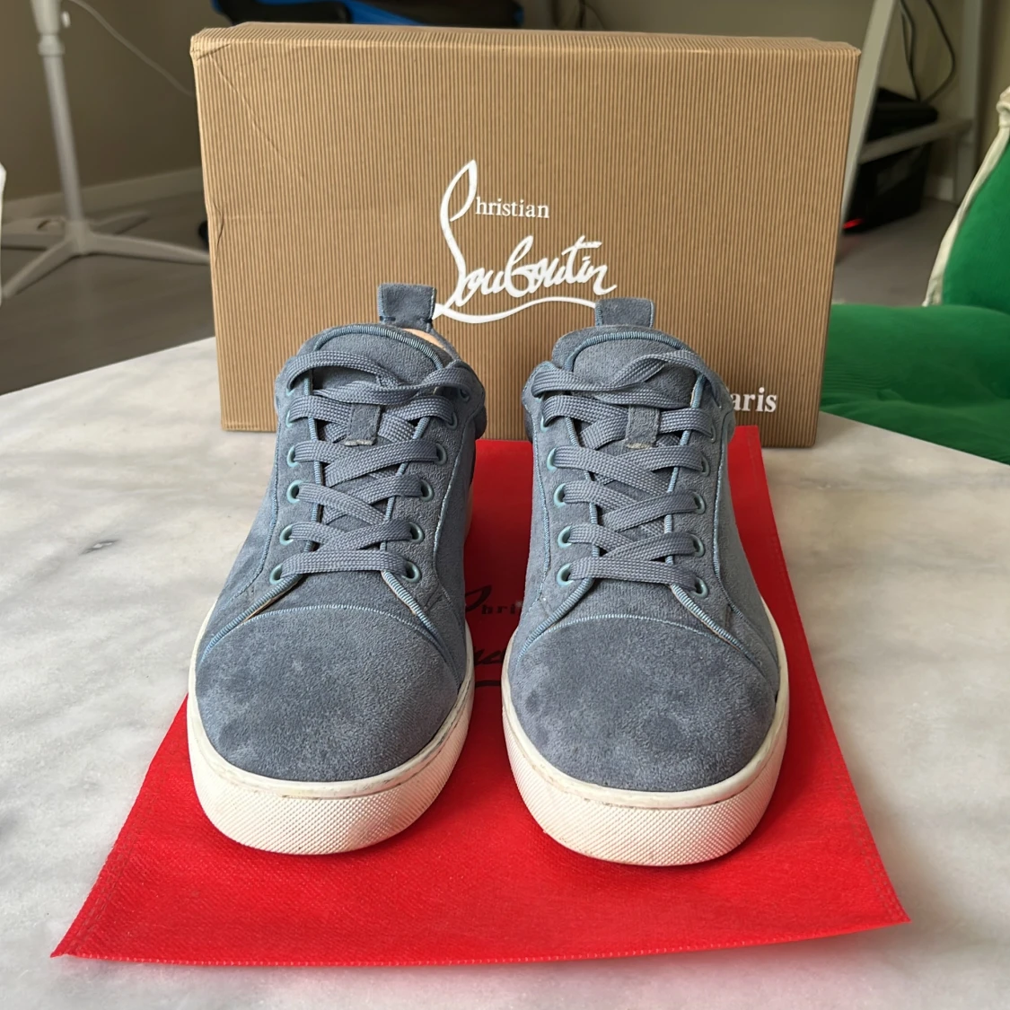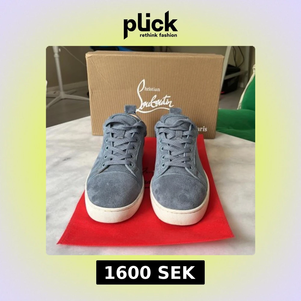 Snygga blå sneakers i mocka från Christian Louboutin med klassisk röd sula och vita kanter. Man får me box dustbag och skyddspåsar och en massa mer. Skorna tvättas självklart innan dom fraktas. Hör av er vid frågor och funderingar😊