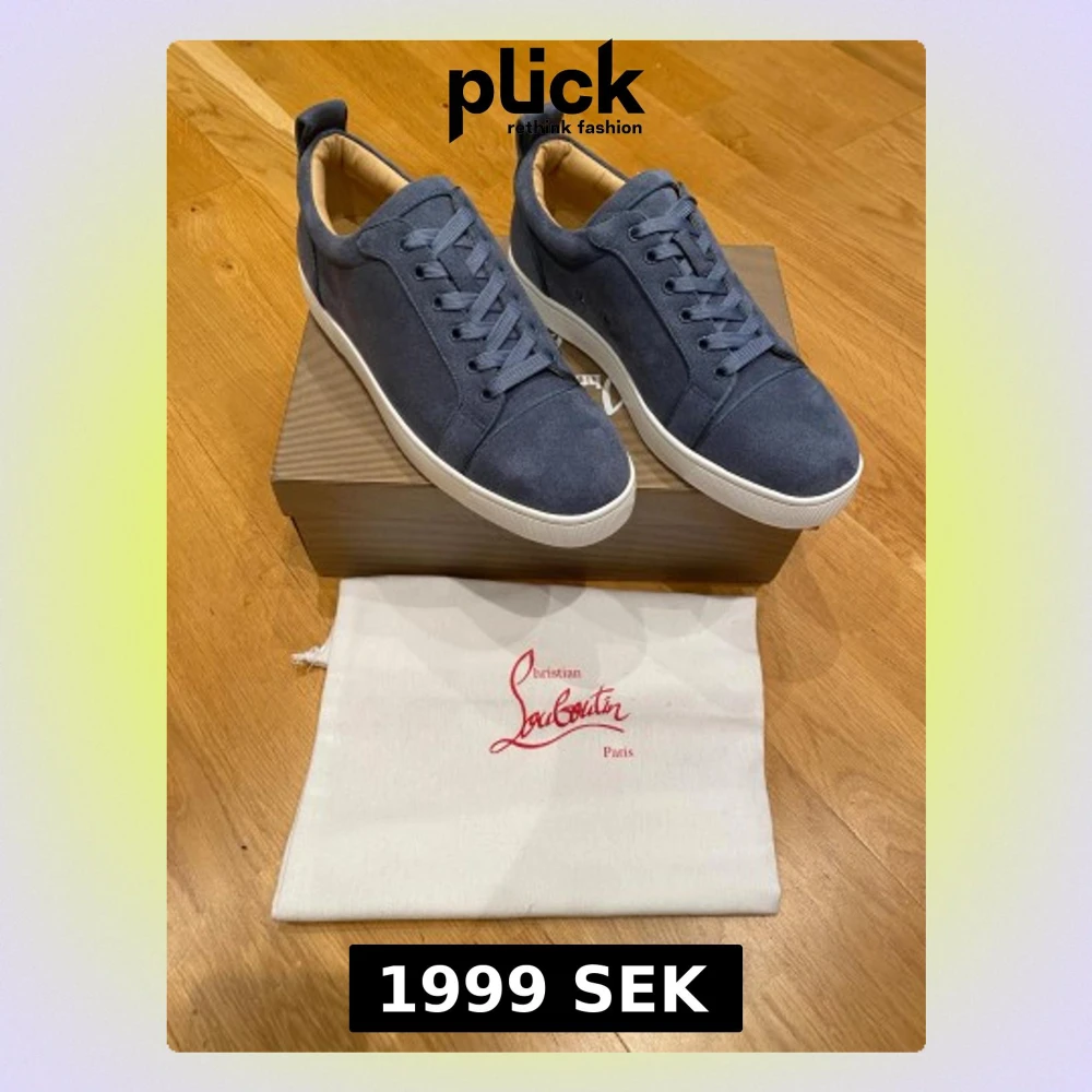 Snygga blå sneakers från Christian Louboutin i mocka med klassisk vit sula och ikonisk röd undersida. Skorna har rund tå, snörning och diskret branding. Perfekta för dig som vill ha en stilren men ändå lyxig look.