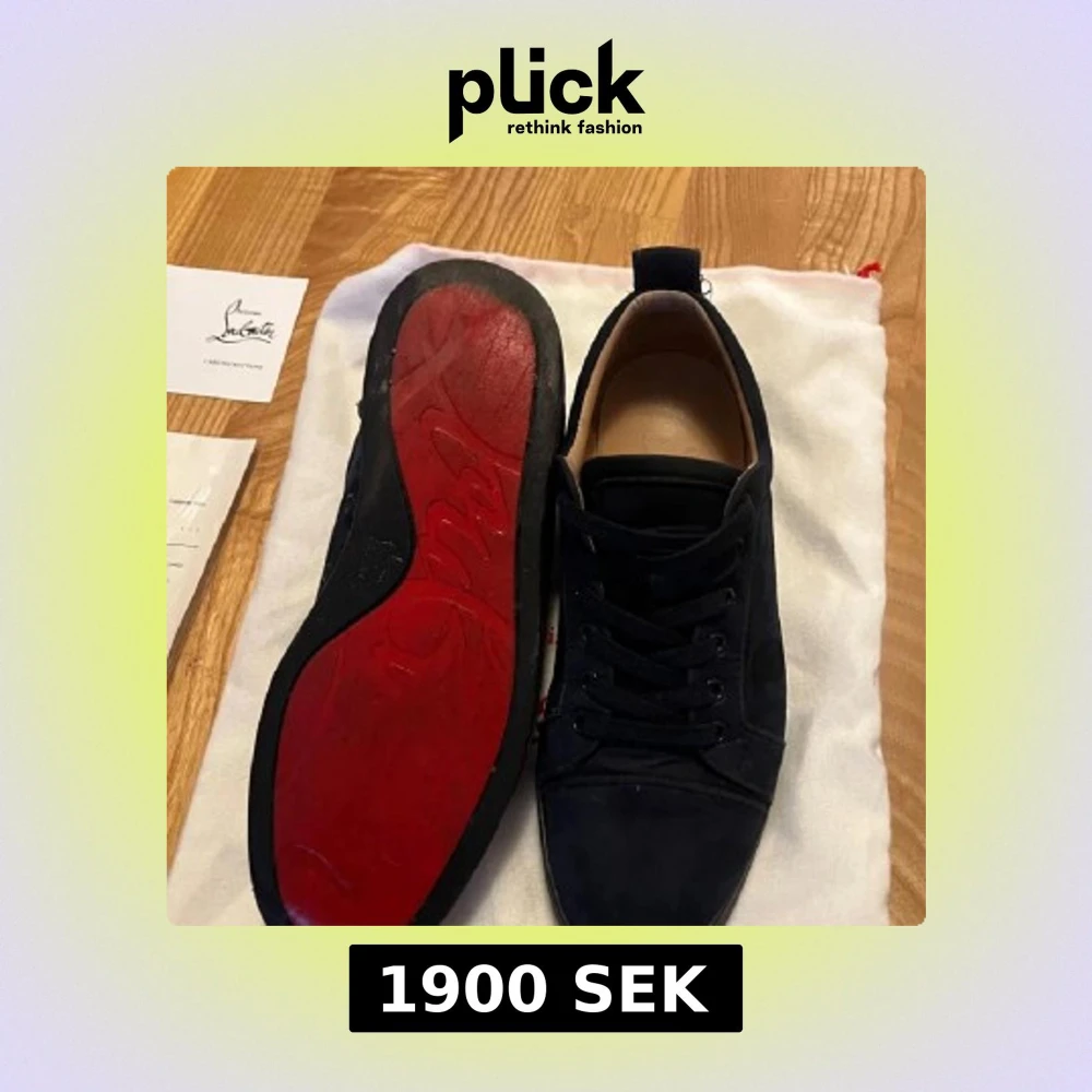 Snygga mörkblå sneakers från Christian Louboutin i mocka med klassisk röd sula. Skorna har rund tå, svarta snören och diskreta detaljer. Insidan är ljusbeige och de har en stilren, lyxig vibe som sticker ut med den ikoniska röda undersidan. Är i genuint fint skick