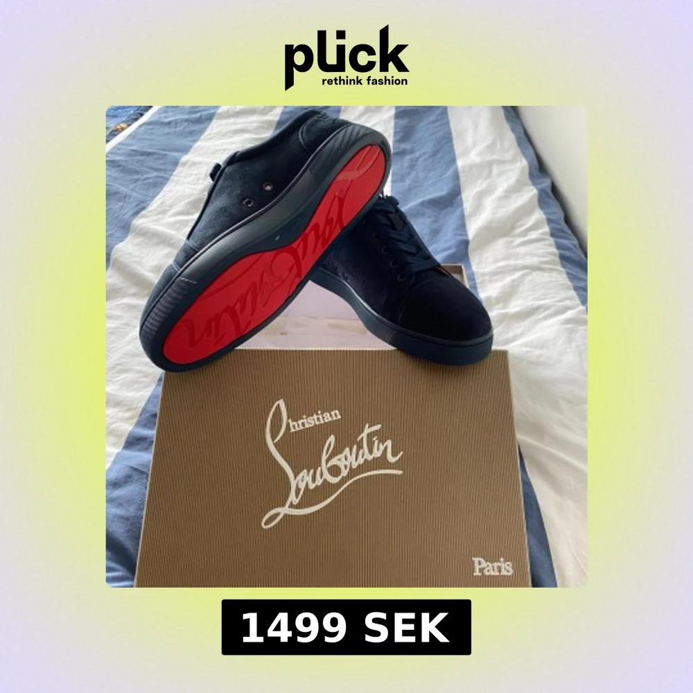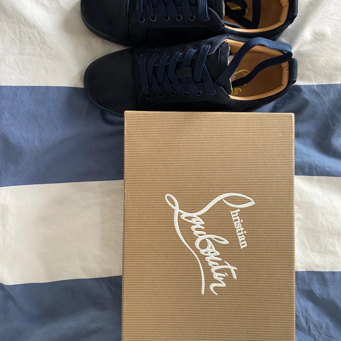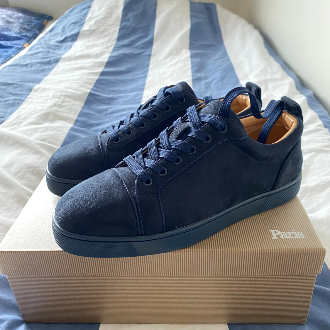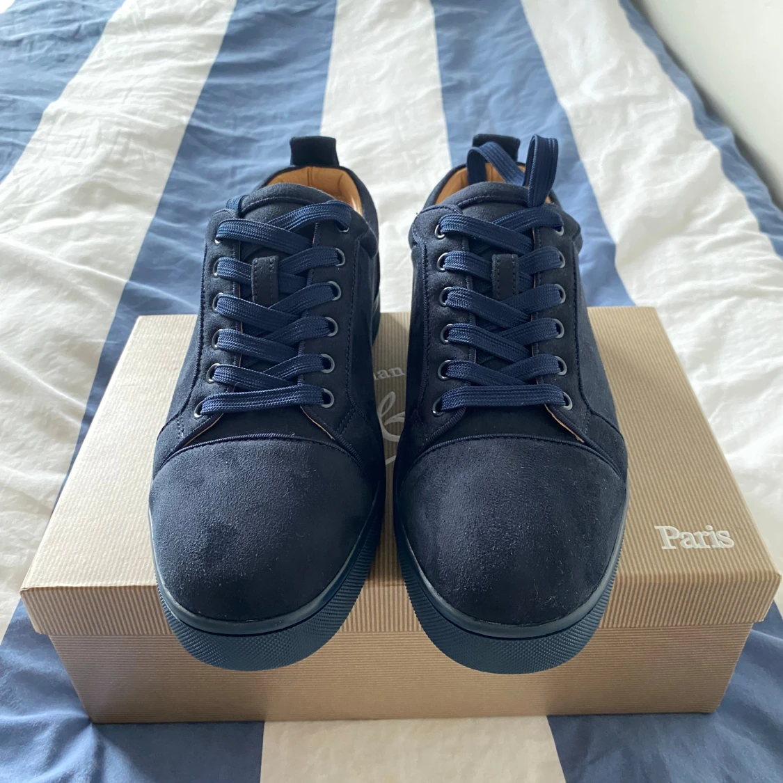 Snygga mörkblå sneakers från Christian Louboutin i mocka med klassisk röd sula. Skorna har rund tå, platt sula och snörning. Insidan är fodrad i beige läder för extra komfort. Perfekta för dig som vill ha en lyxig och stilren look.