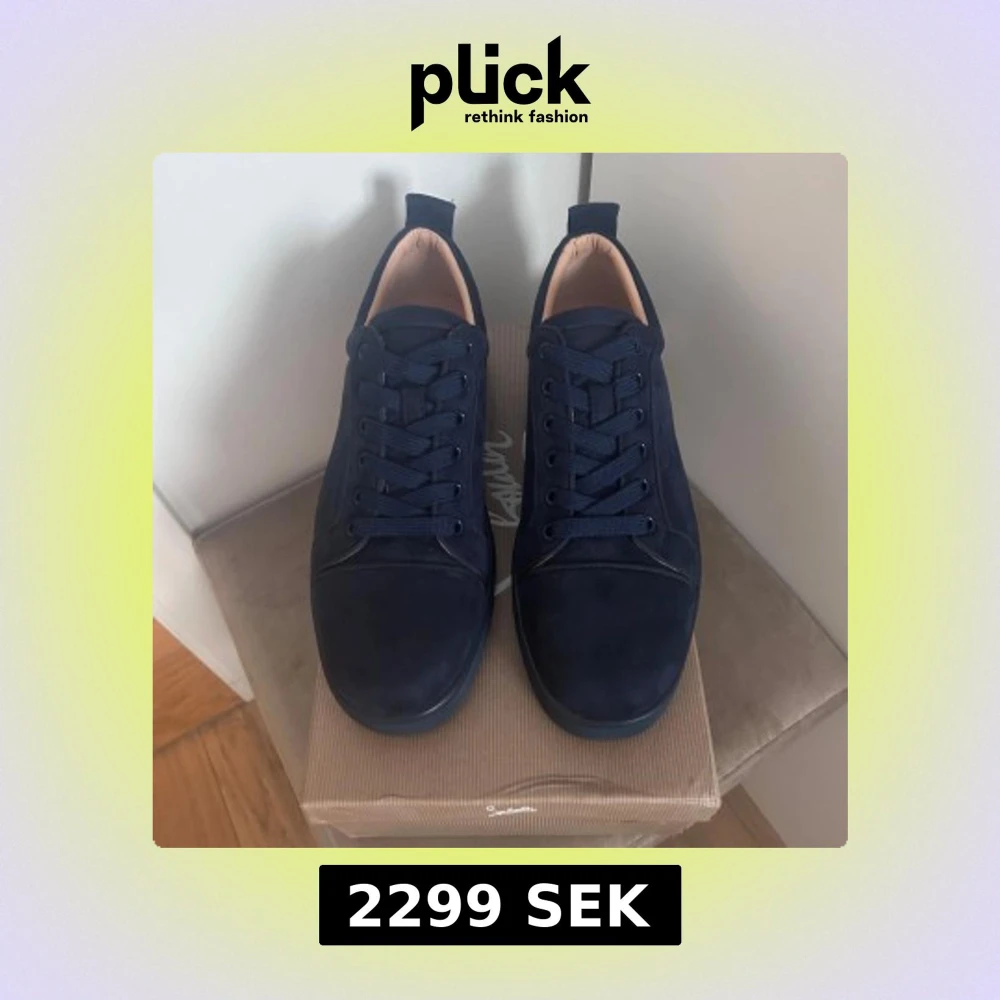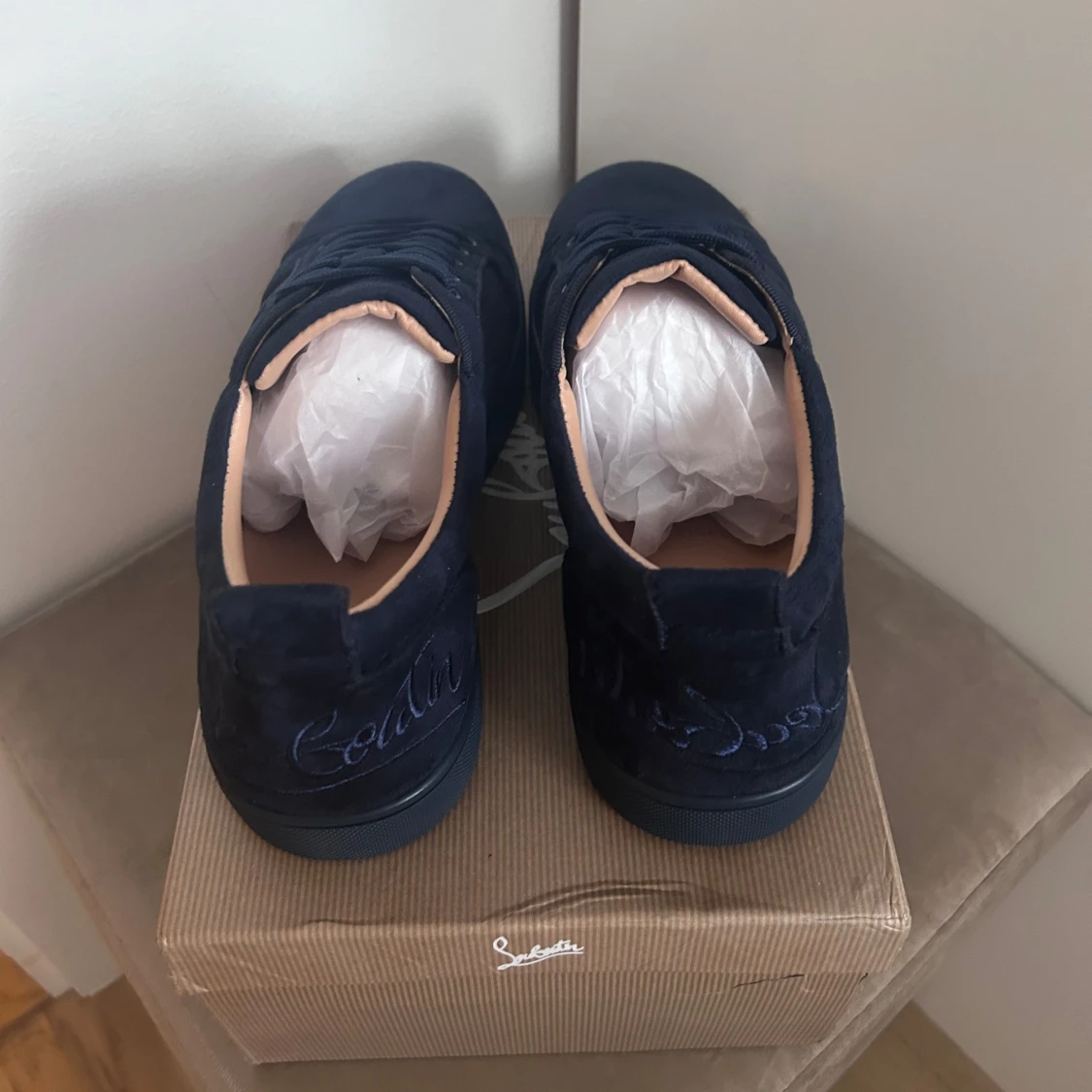 Snygga mörkblå sneakers i mocka från Christian Louboutin med klassisk röd sula och snörning. Perfekta för en stilren look.