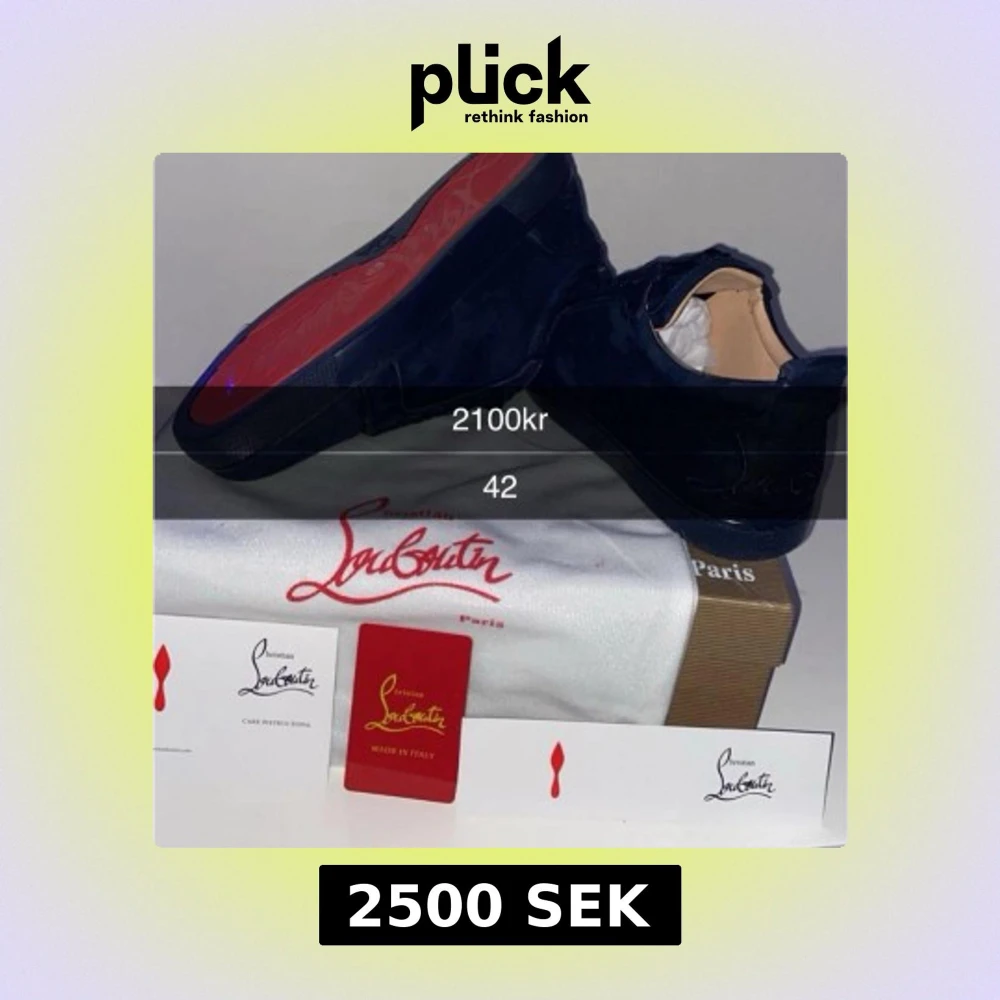 Säljer ett par mörkblå sneakers från Christian Louboutin med klassisk röd sula. Skorna har en stilren design med rund tå och är tillverkade i mocka. Perfekt för dig som gillar exklusiva märken och vill sticka ut med en lyxig detalj.