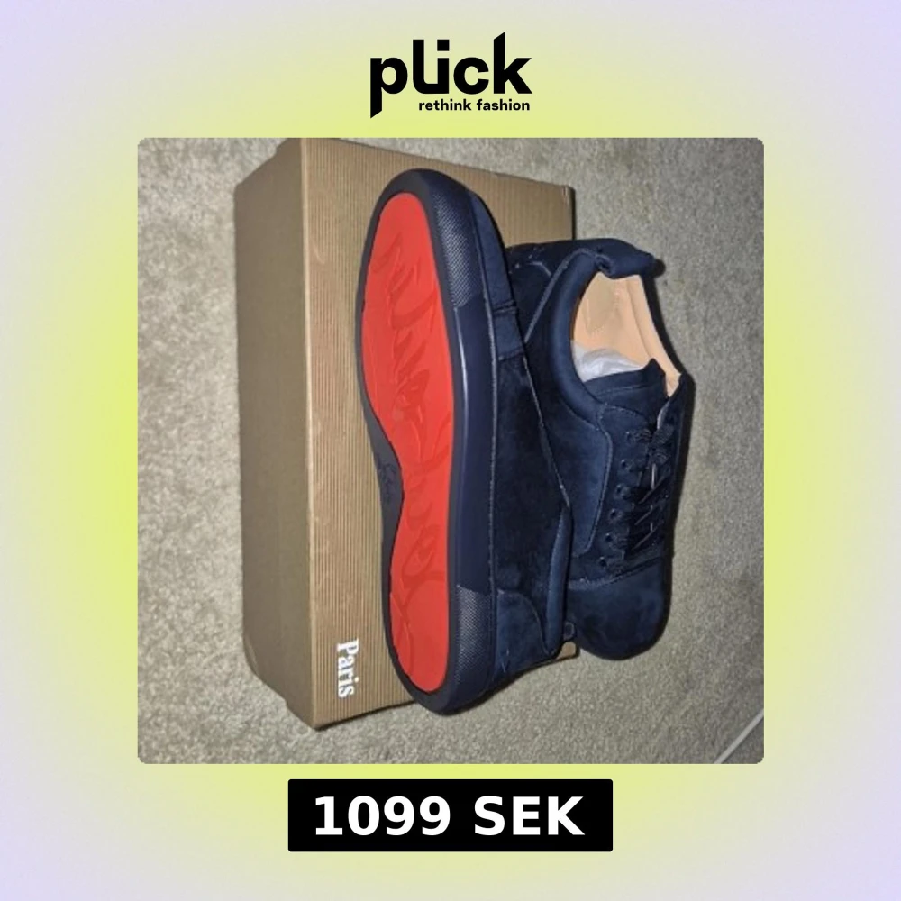 Snygga mörkblå sneakers från Christian Louboutin i mocka med klassisk röd sula. Skorna har rund tå, platt sula och snörning. Insidan är i beige läder och de kommer med originalkartong och dustbag. Perfekta för dig som vill sticka ut med exklusiva detaljer.