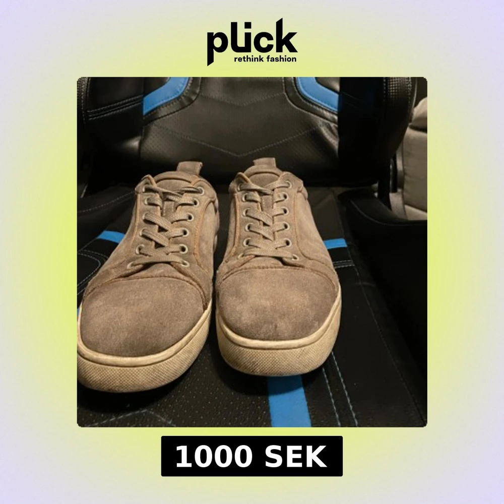 Säljer ett par gråa sneakers från Christian Louboutin i mocka med klassisk röd sula och vita kanter. Skorna har snörning och rund tå, samt en stilren och enkel design som passar till många outfits. Kommer med originalkartong. Har fått ett hål i hälen men de är fixat och syns inte vid användning