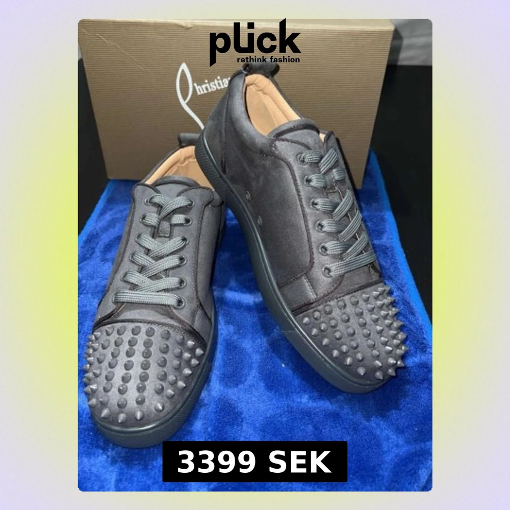 Grymma svarta sneakers från Christian Louboutin med mattsvarta nitar på tån och den ikoniska röda sulan. Skorna har snörning, rund tå och är tillverkade i mocka med detaljer i skinn. Perfekta för dig som vill sticka ut med en edgy vibe.