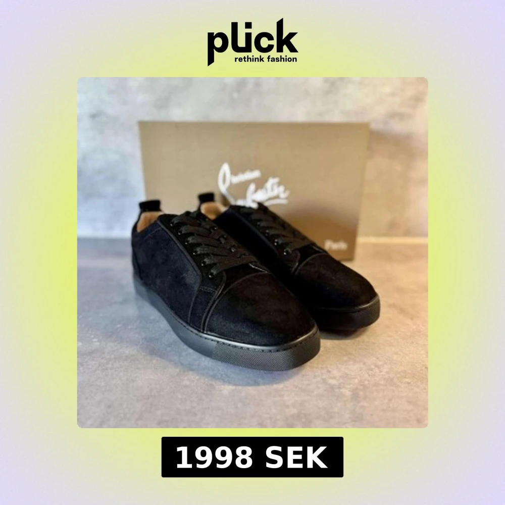 Säljer ett par svarta sneakers från Christian Louboutin i mocka med klassisk röd sula. Skorna har rund tå, svarta snören och diskret logga på sulan. Perfekta för dig som vill ha en stilren och lyxig look.
