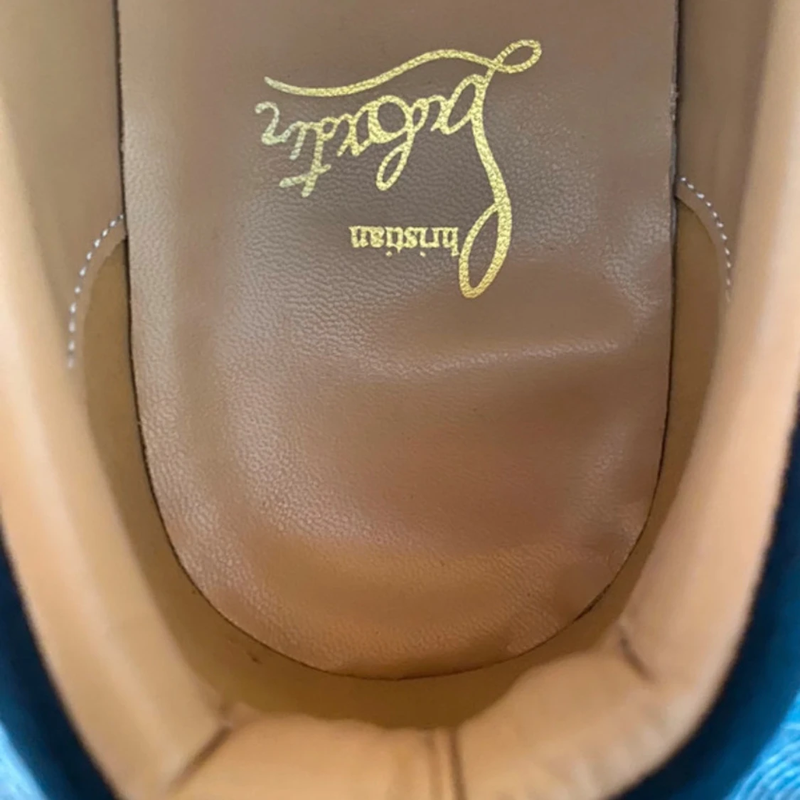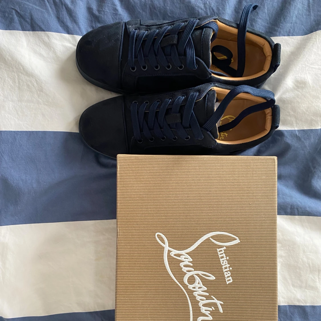 Snygga mörkblå sneakers från Christian Louboutin i mocka med klassisk röd sula. Skorna har rund tå, platt sula och snörning. Insidan är i lyxigt ljust skinn och designen är stilren och exklusiv. Perfekta för dig som vill sticka ut med en ikonisk detalj.