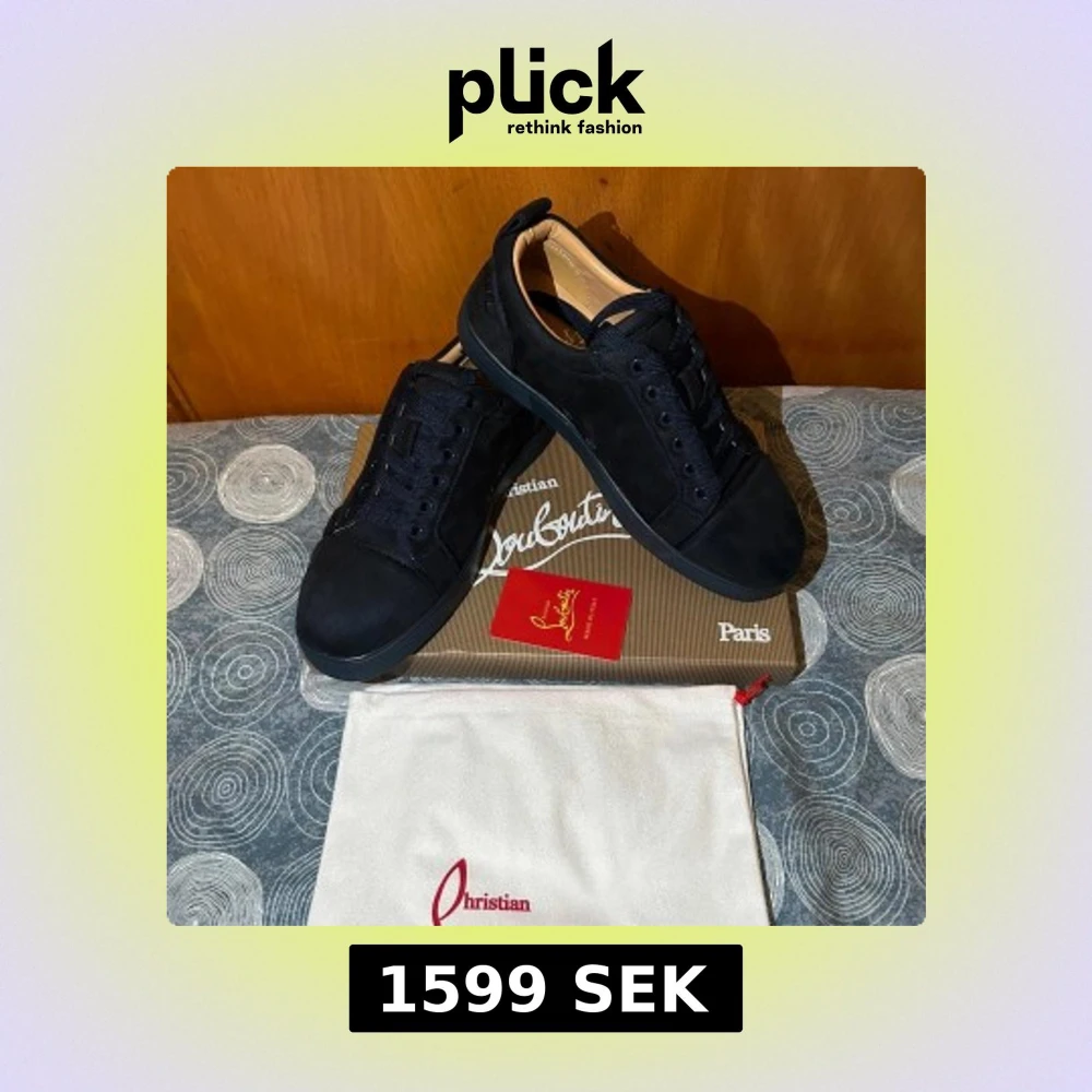 Snygga svarta sneakers från Christian Louboutin i mjuk mocka med klassisk röd sula. Skorna har rund tå, svarta skosnören och diskret broderad logga på hälen. Perfekta för dig som vill ha en lyxig och stilren look med en ikonisk touch.
