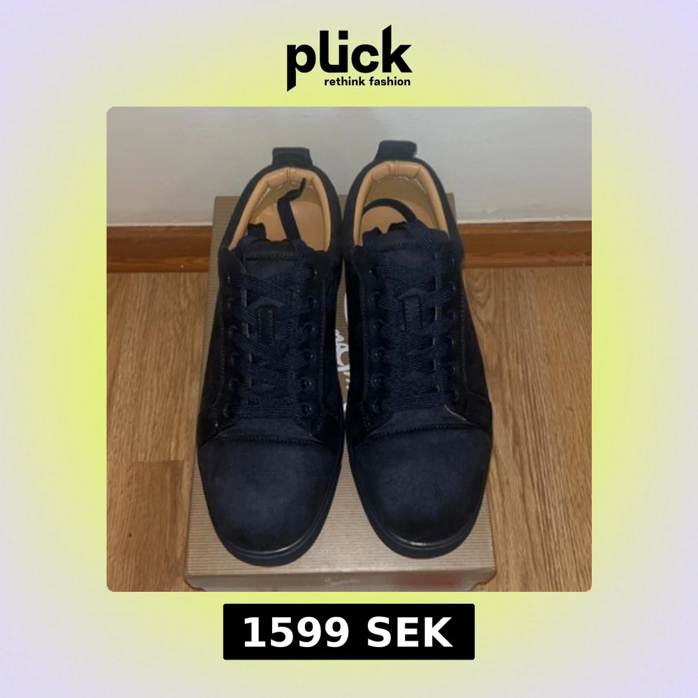 Snygga svarta sneakers från Christian Louboutin i mocka med klassisk röd sula och broderad logga baktill. Skorna har rund tå, platt sula och snörning framtill. Perfekta för dig som vill ha en lyxig och stilren look med en ikonisk touch.