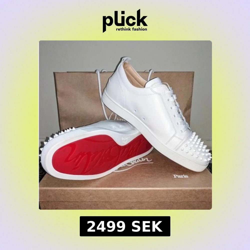 Säljer ett par vita sneakers från Christian Louboutin med ikonisk röd sula och coola nitar framtill. Skorna har snörning och är tillverkade i slätt skinn för en lyxig känsla. Perfekt för dig som vill sticka ut med en edgy och exklusiv stil. Finns äkthets bevis