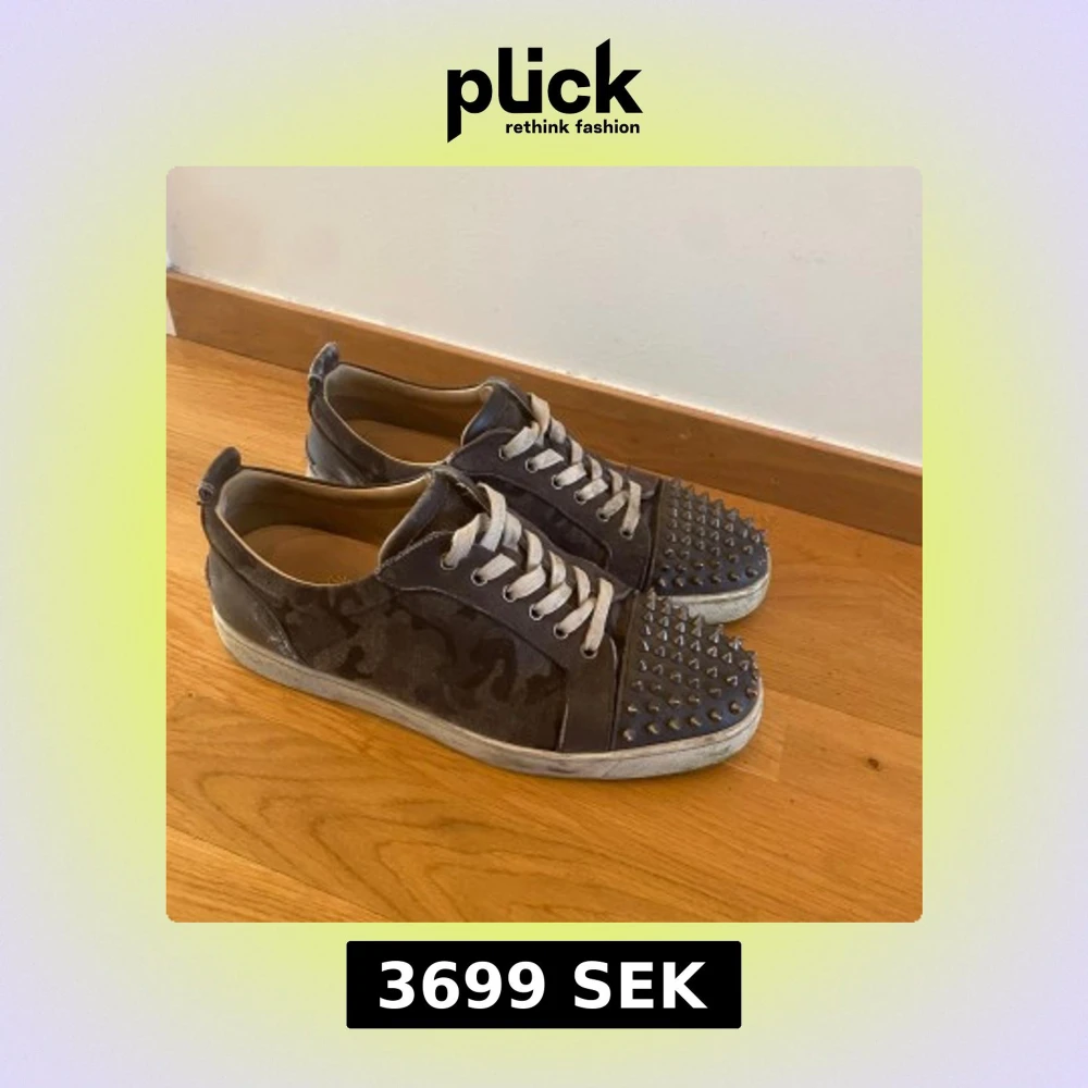 Säljer ett par svarta sneakers från Christian Louboutin med coola silverfärgade nitar på tån. Skorna har snörning, rund tå och är gjorda i mocka med kamouflagemönster. Perfekta för dig som vill sticka ut med din stil. Storlek 43,5 men passar även 43 och 44! Kom privat för yttliggare funderingar