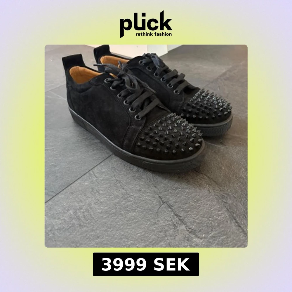 Svarta sneakers från Christian Louboutin i mocka med coola svarta nitar på tån och klassisk röd sula med logga. Skorna har snörning och rund tå, samt en platt sula. Insidan är beige och de har en edgy vibe som sticker ut. Pris går att diskuteras 👍