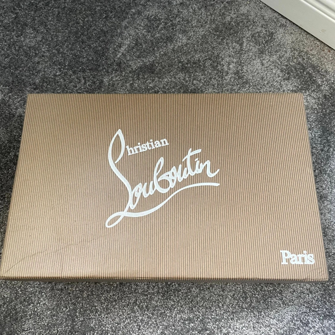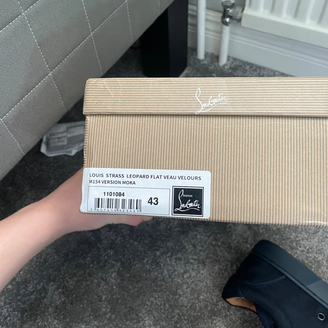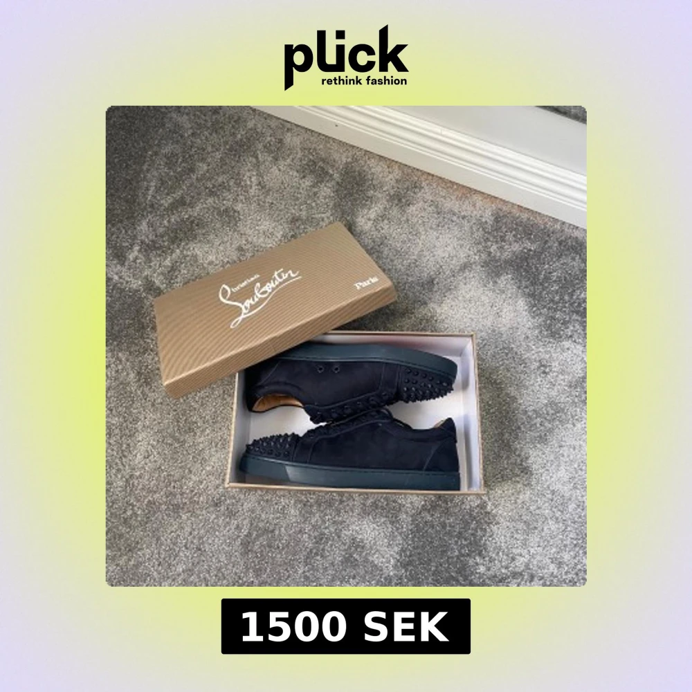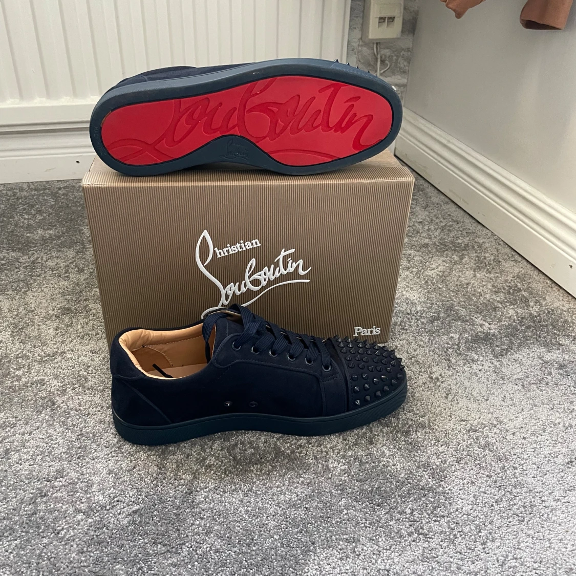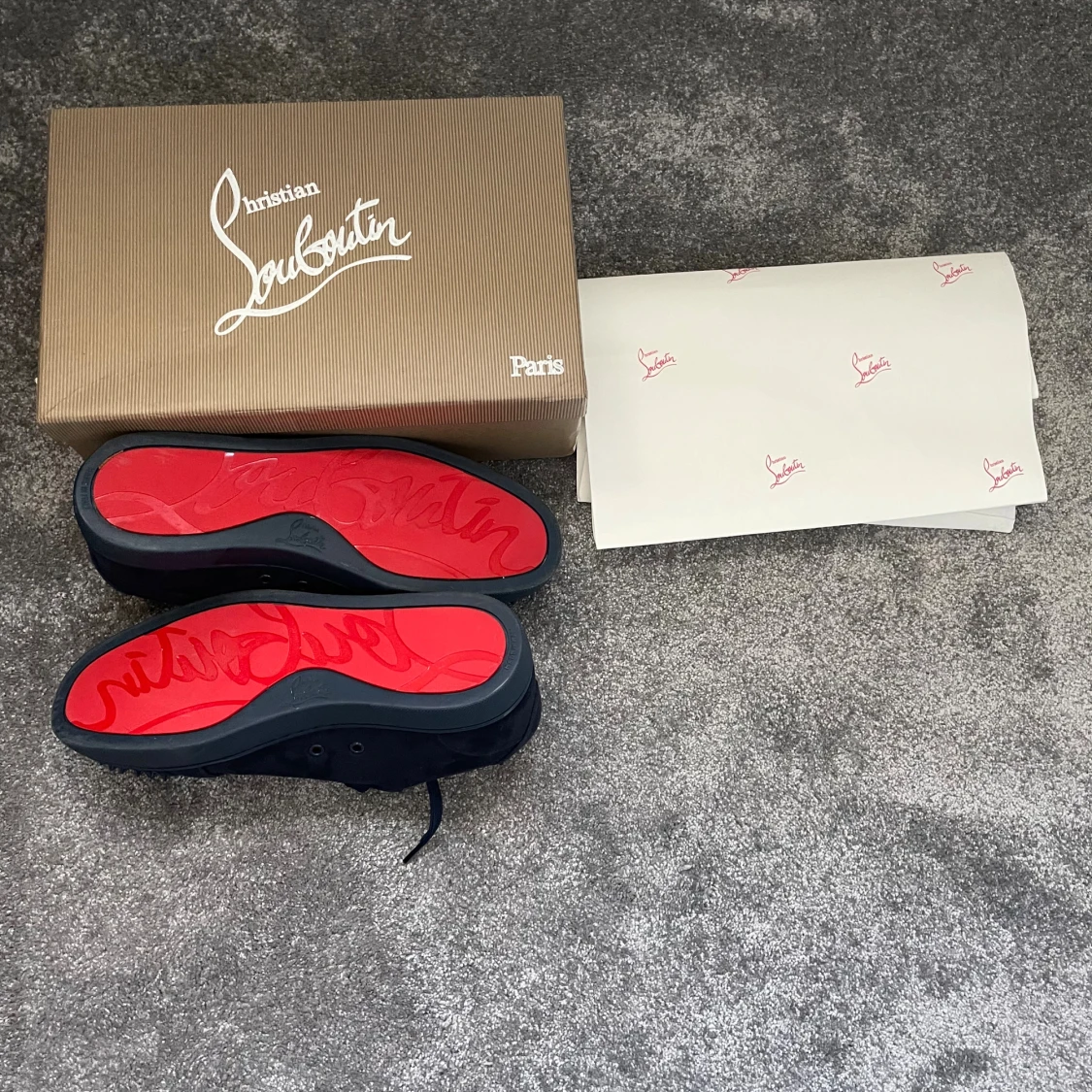 Säljer ett par mörkblå Christian Louboutin Louis Strass sneakers i mocka med coola nitar framtill och den ikoniska röda sulan. Skorna har snörning och en lyxig känsla med läderdetaljer på insidan. Perfekta för dig som vill sticka ut med exklusiv streetstyle.