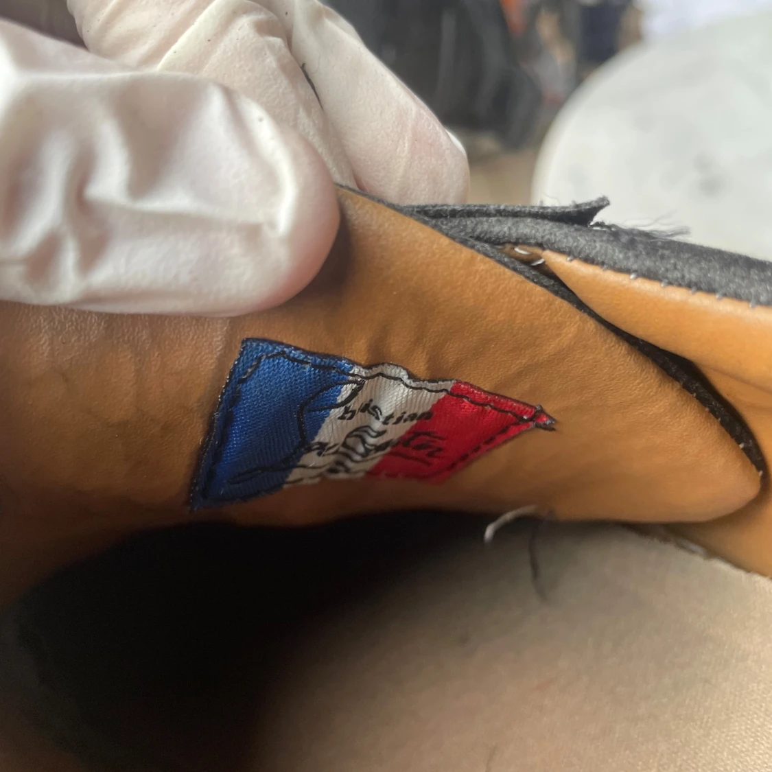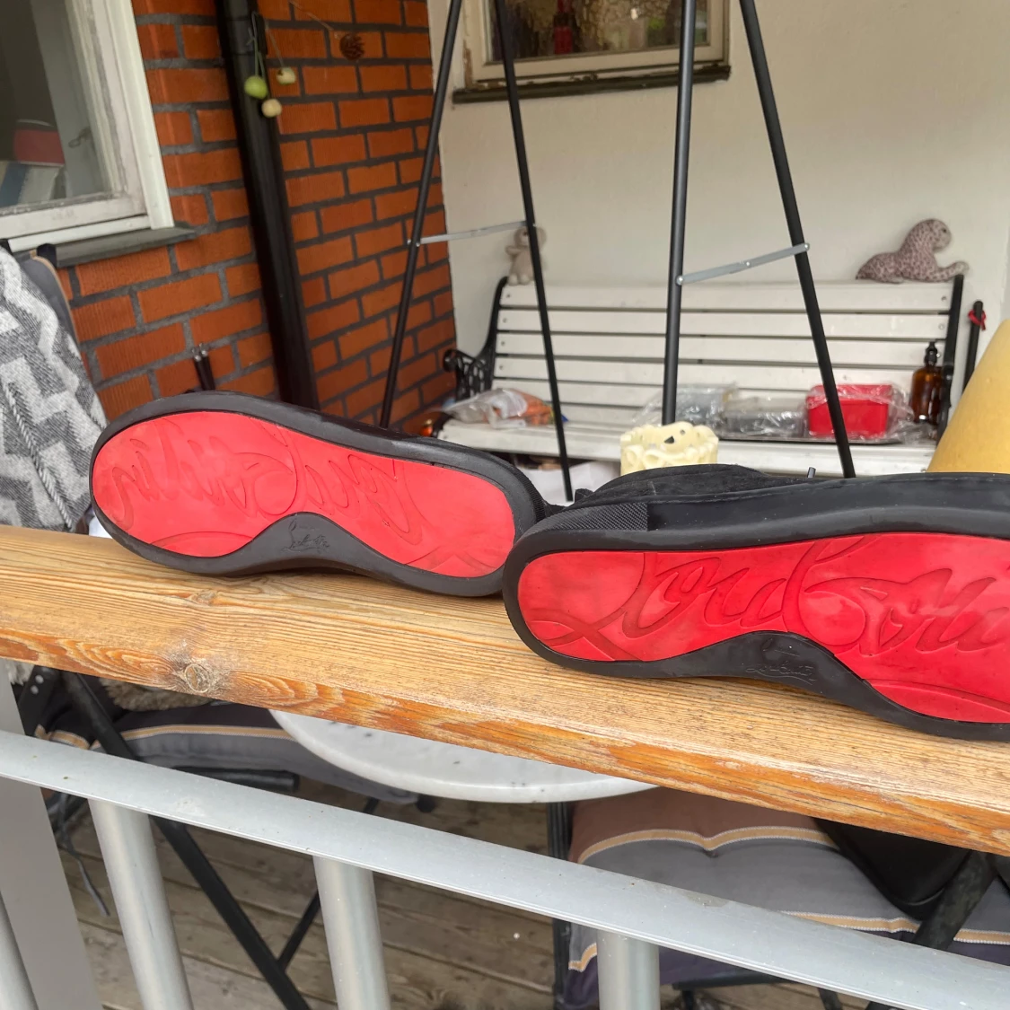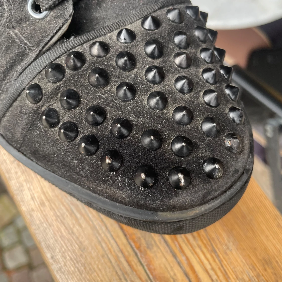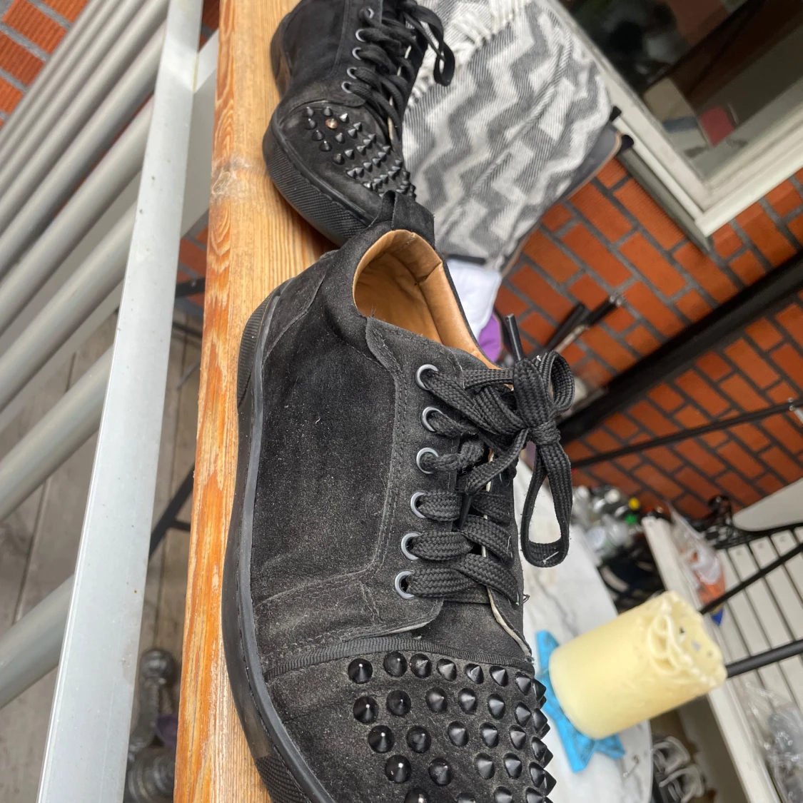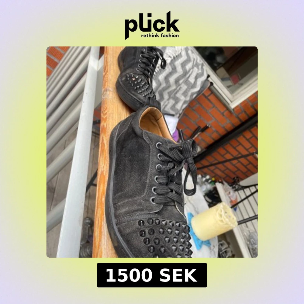 Säljer ett par svarta sneakers från Christian Louboutin med svarta nitar på tån och klassisk röd sula. Skorna har snörning och är tillverkade i mocka med svarta detaljer. Perfekta för dig som vill sticka ut med en edgy stil.