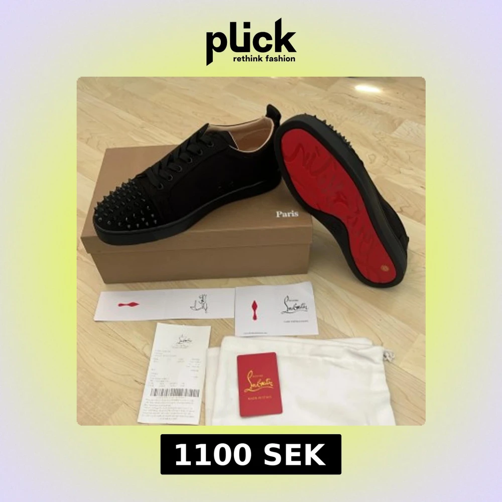 Exklusiva svarta sneakers från Christian Louboutin med ikonisk röd sula och svarta nitar på tån. Skorna har snörning, rund tå och är tillverkade i skinn och mocka. Perfekt för dig som vill sticka ut med en lyxig och edgy stil.